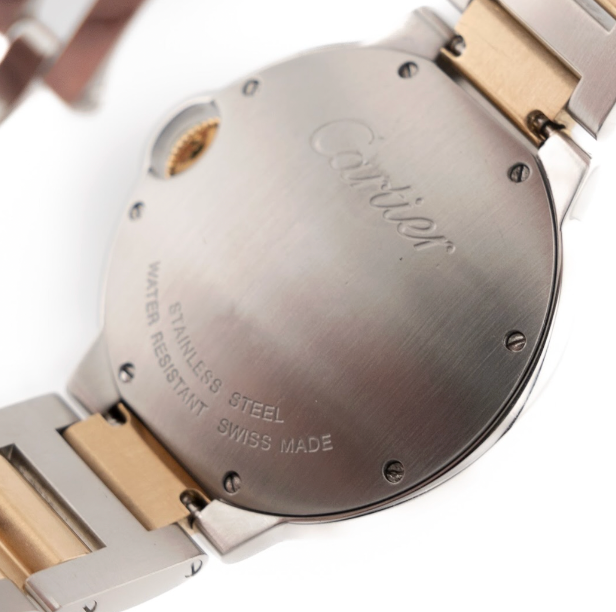 The Cartier Ballon Bleu W69008Z3 combines stainless steel and 18K yellow gold in a refined 36 mm case, featuring a silver guilloché dial, blue sword hands, and Cartier’s signature cabochon crown — powered by a precise quartz movement for timeless elegance and everyday reliability. This piece comes with watch and box, in excellent condition