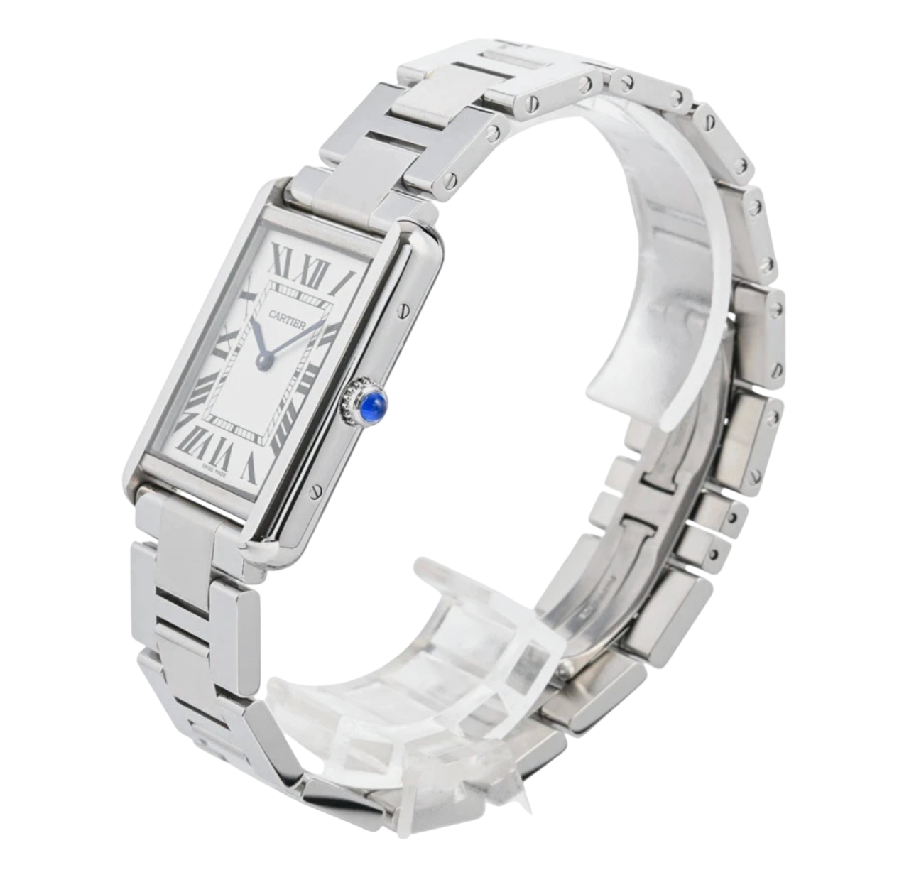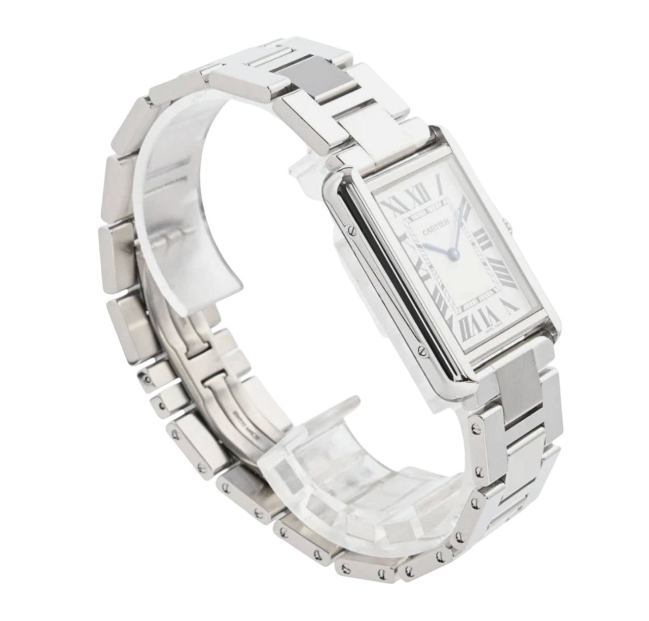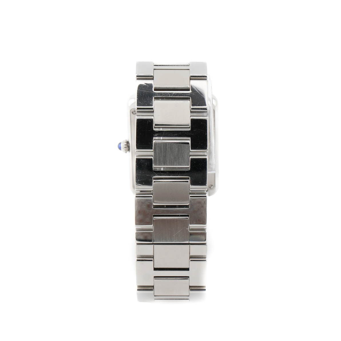 The case is rectangular with the Tank’s signature proportions, measuring approximately 27 × 35 mm with a slim profile (~6 mm) and crafted in stainless steel. The dial is a silvered opaline with black Roman numerals and blued-steel sword hands. The watch runs on a quartz movement, offering low-maintenance precision. It is water-resistant to about 30 m (3 bar) and protected by a sapphire crystal. The steel bracelet is integrated and fits seamlessly with the case, giving a sleek, elegant aesthetic.
