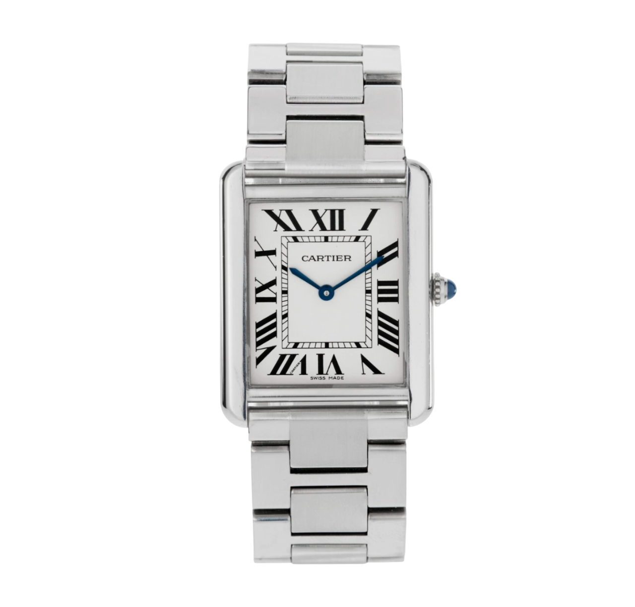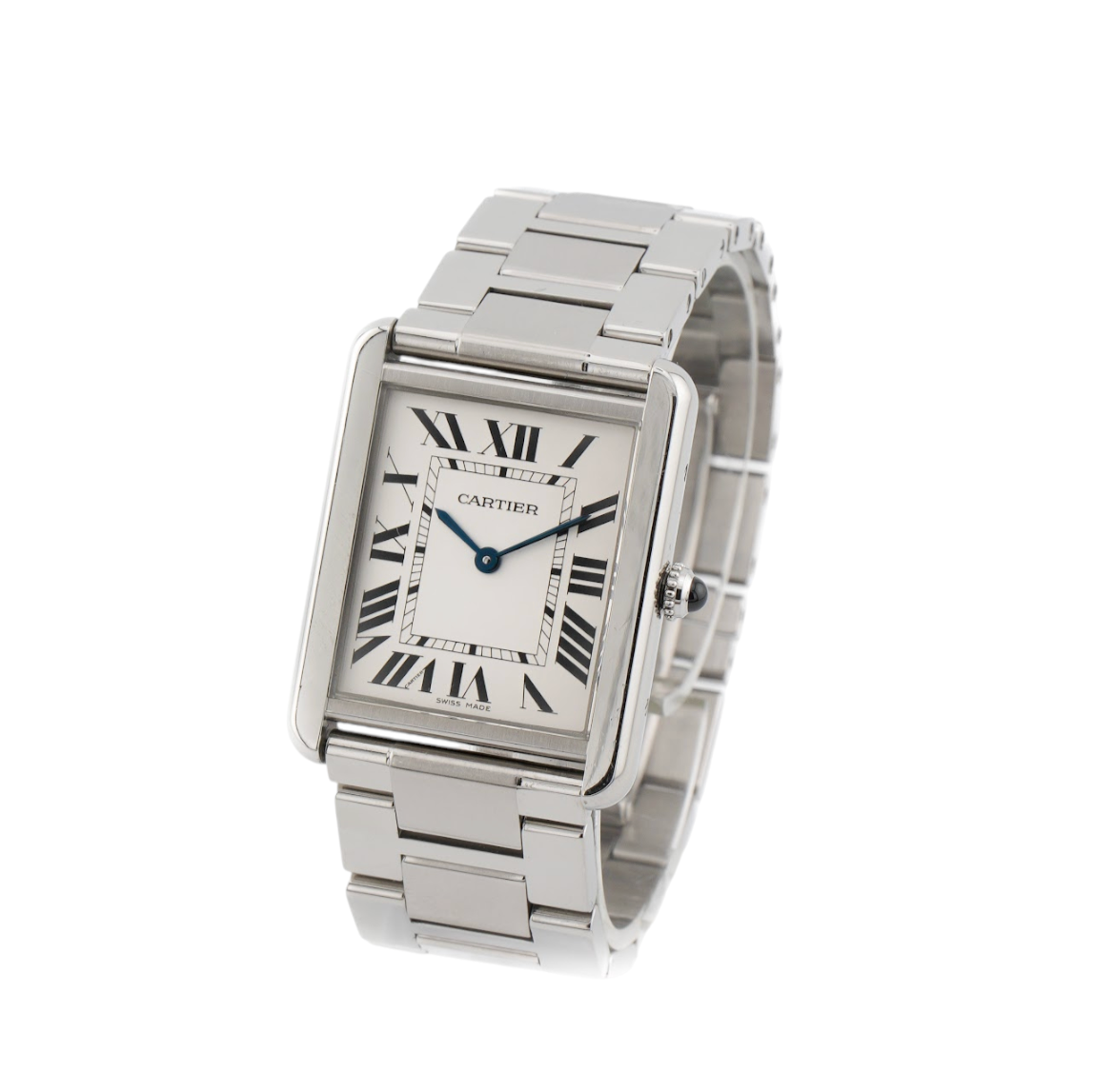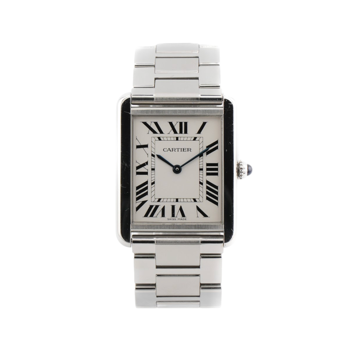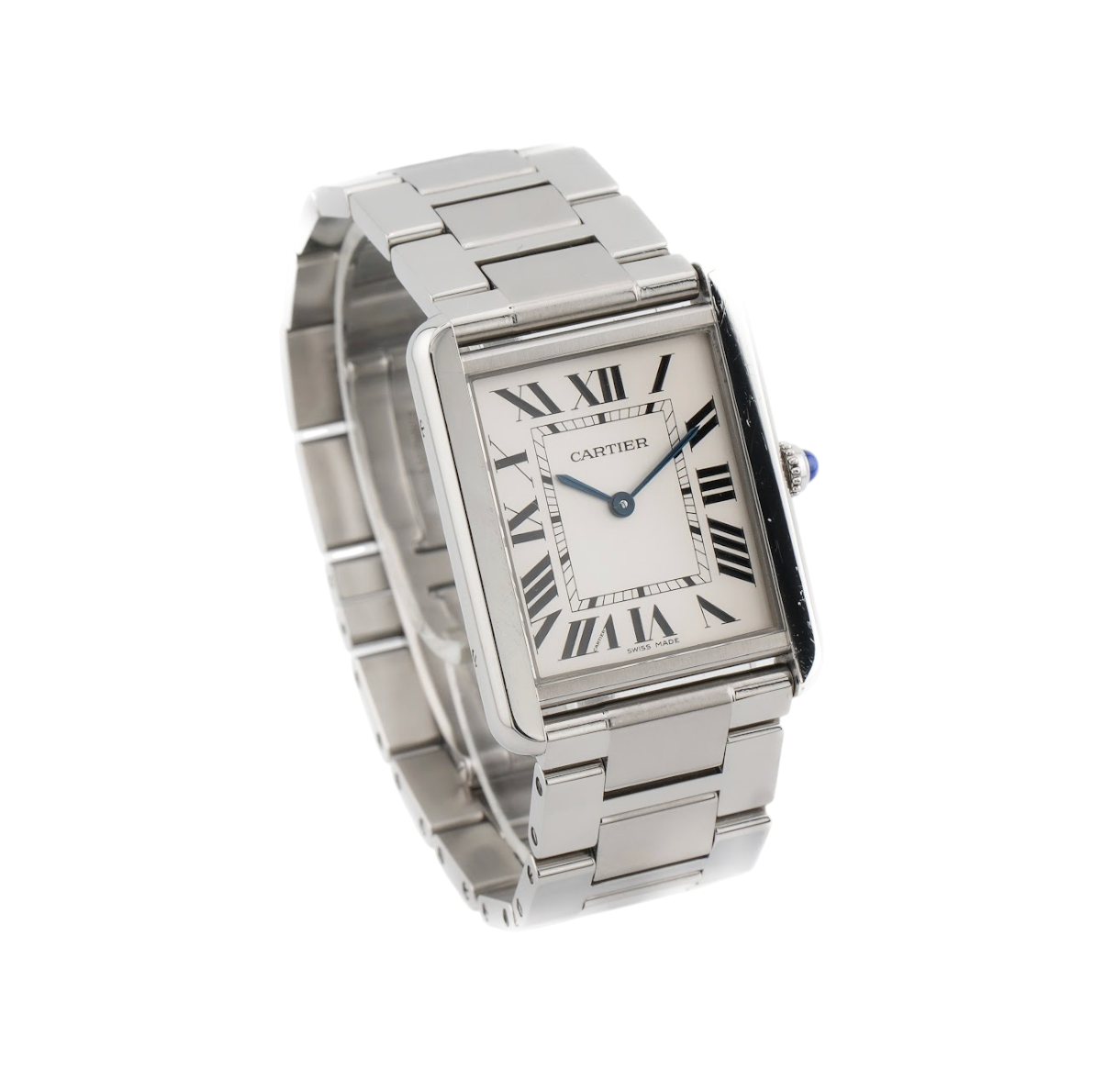 The case is rectangular with the Tank’s signature proportions, measuring approximately 27 × 35 mm with a slim profile (~6 mm) and crafted in stainless steel. The dial is a silvered opaline with black Roman numerals and blued-steel sword hands. The watch runs on a quartz movement, offering low-maintenance precision. It is water-resistant to about 30 m (3 bar) and protected by a sapphire crystal. The steel bracelet is integrated and fits seamlessly with the case, giving a sleek, elegant aesthetic.
