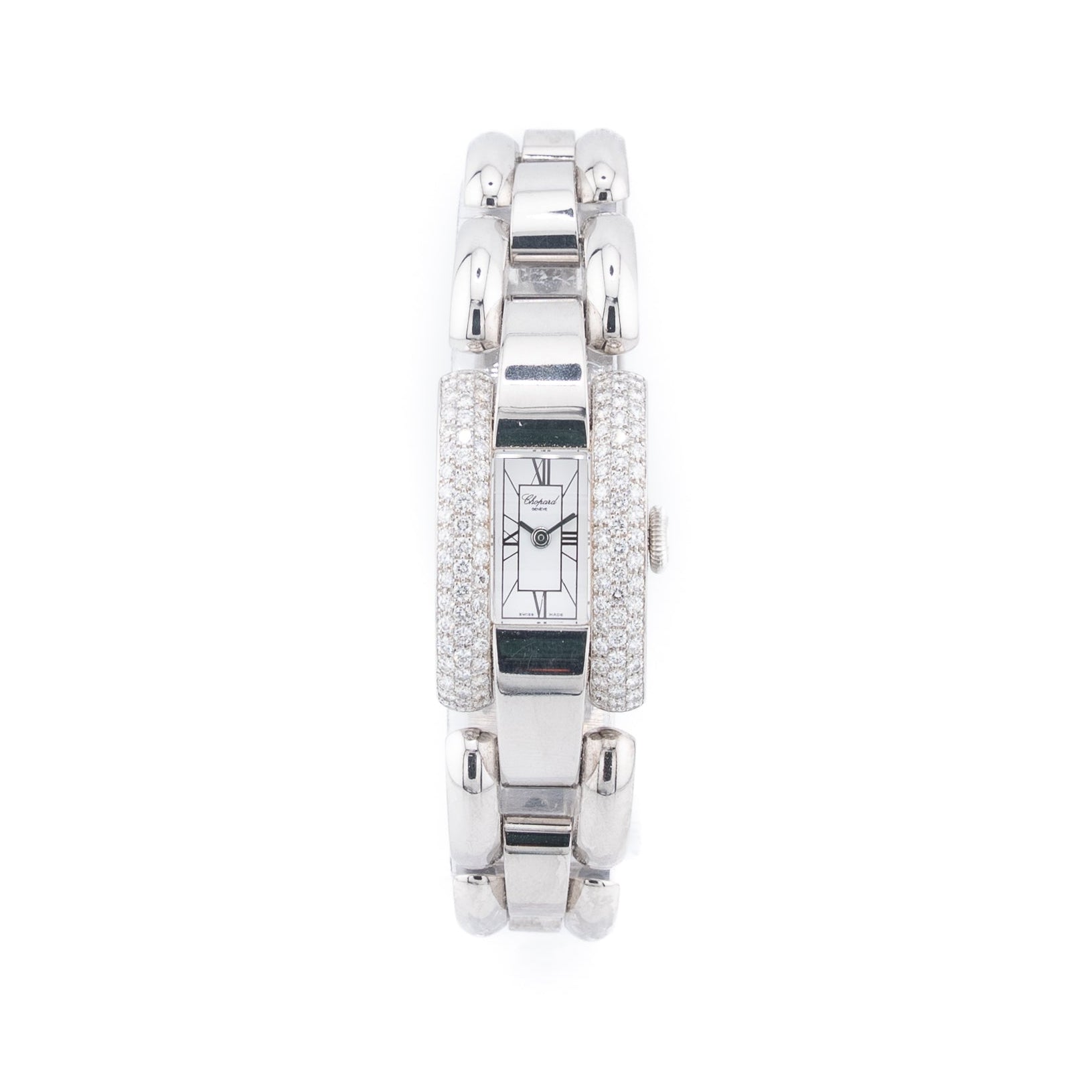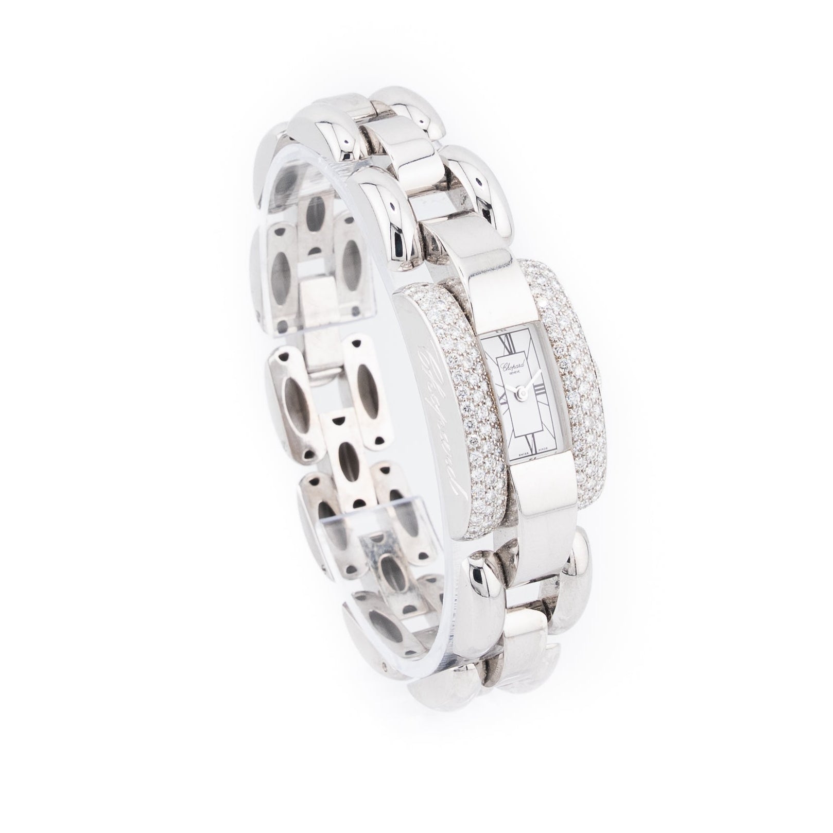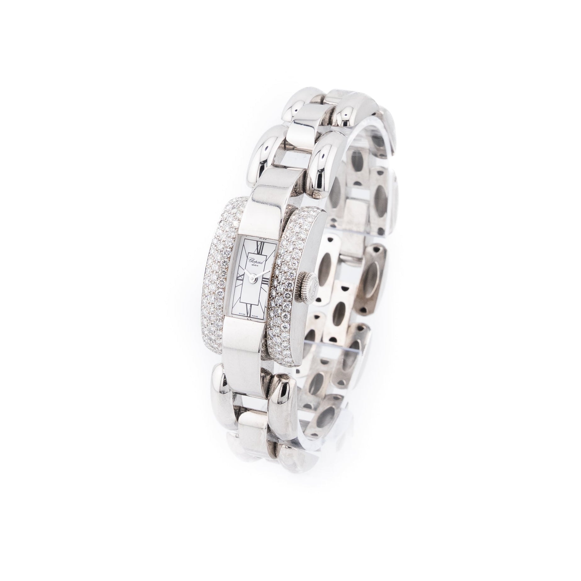 The Chopard La Strada is a luxurious and elegant timepiece, crafted in 18k white gold and richly adorned with 116 F-VVS cut diamonds. Its curved, rectangular case offers a graceful, architectural form that hugs the wrist, while the bezel is completely pavé-set, creating a dazzling halo of sparkle. The dial is a crisp white with Roman numerals and delicate silver-tone hands, giving it a refined, timeless appeal.