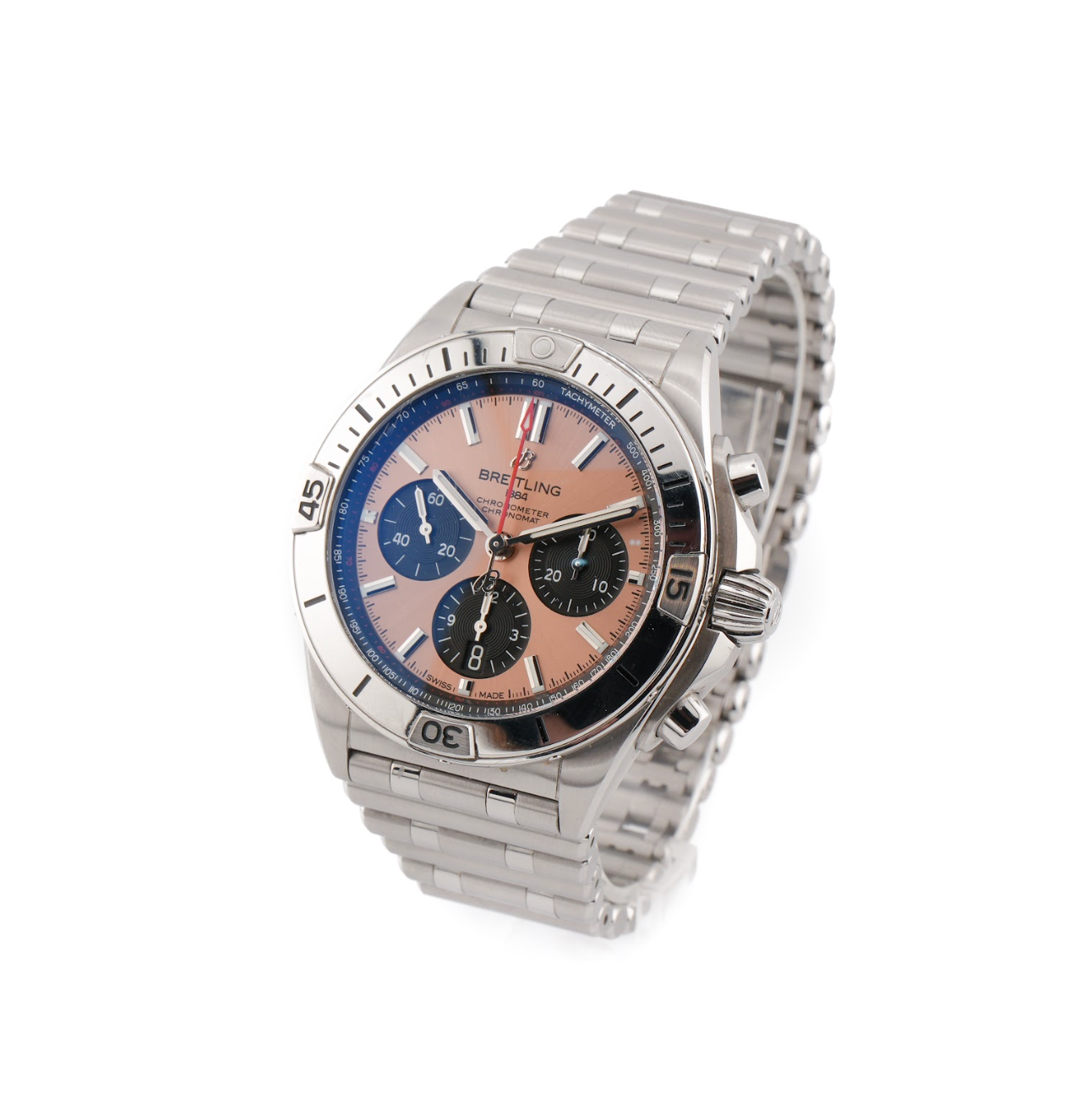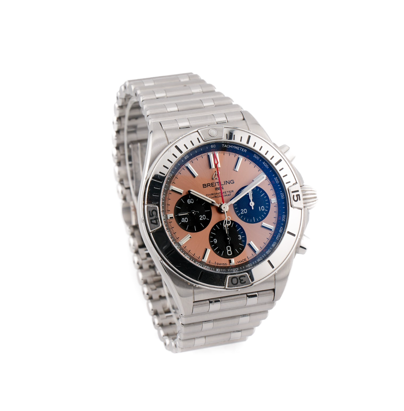 The Breitling Chronomat B01 42 with salmon dial is a sophisticated take on the brand’s iconic chronograph, combining robust performance with refined style. Housed in a 42 mm stainless steel case with a unidirectional ratcheted bezel, sapphire crystal, and 200 m water resistance, it features a striking salmon dial with chronograph functions and a date display.