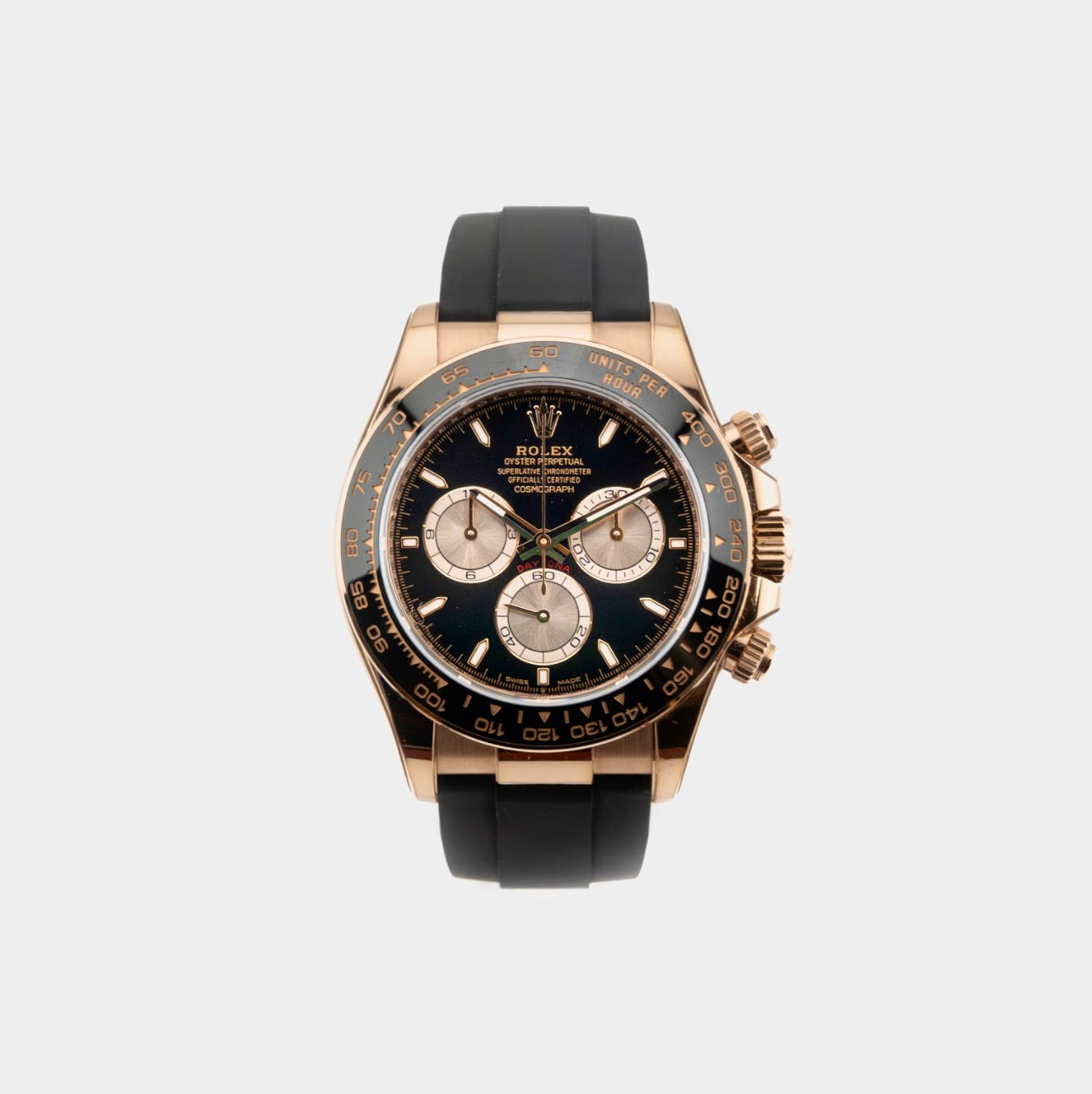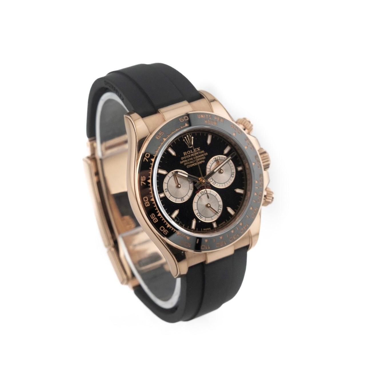 The Rolex Daytona in Everose Gold set with a Bright Black Dial with Sundust subdials on the Oysterflex Bracelet is the perfect fusion of elegance and sportiness. Crafted from 18k Everose gold, this timepiece exudes warmth and luxury. The Black dial, accented with contrasting subdials and Chromalight luminescence, enhances both legibility and overall appeal.