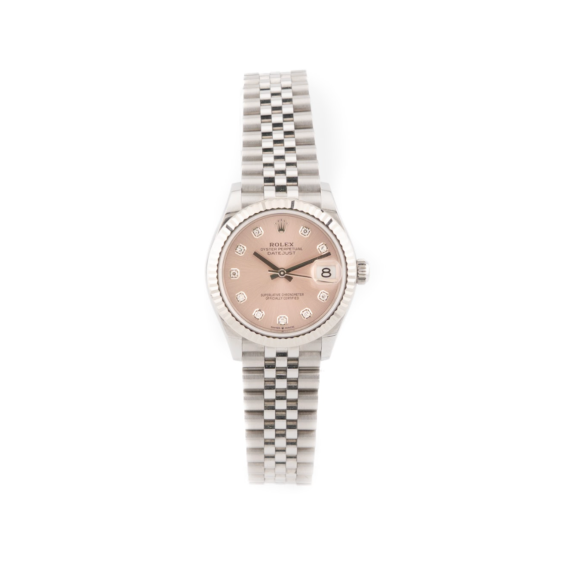 The Rolex Datejust 31 in Oystersteel delivers timeless elegance with a pink dial and diamond hour markers—a combination that balances classic Rolex precision with refined sophistication. The iconic fluted bezel frames the dial beautifully, while the five-piece link Jubilee bracelet offers both comfort and visual appeal.