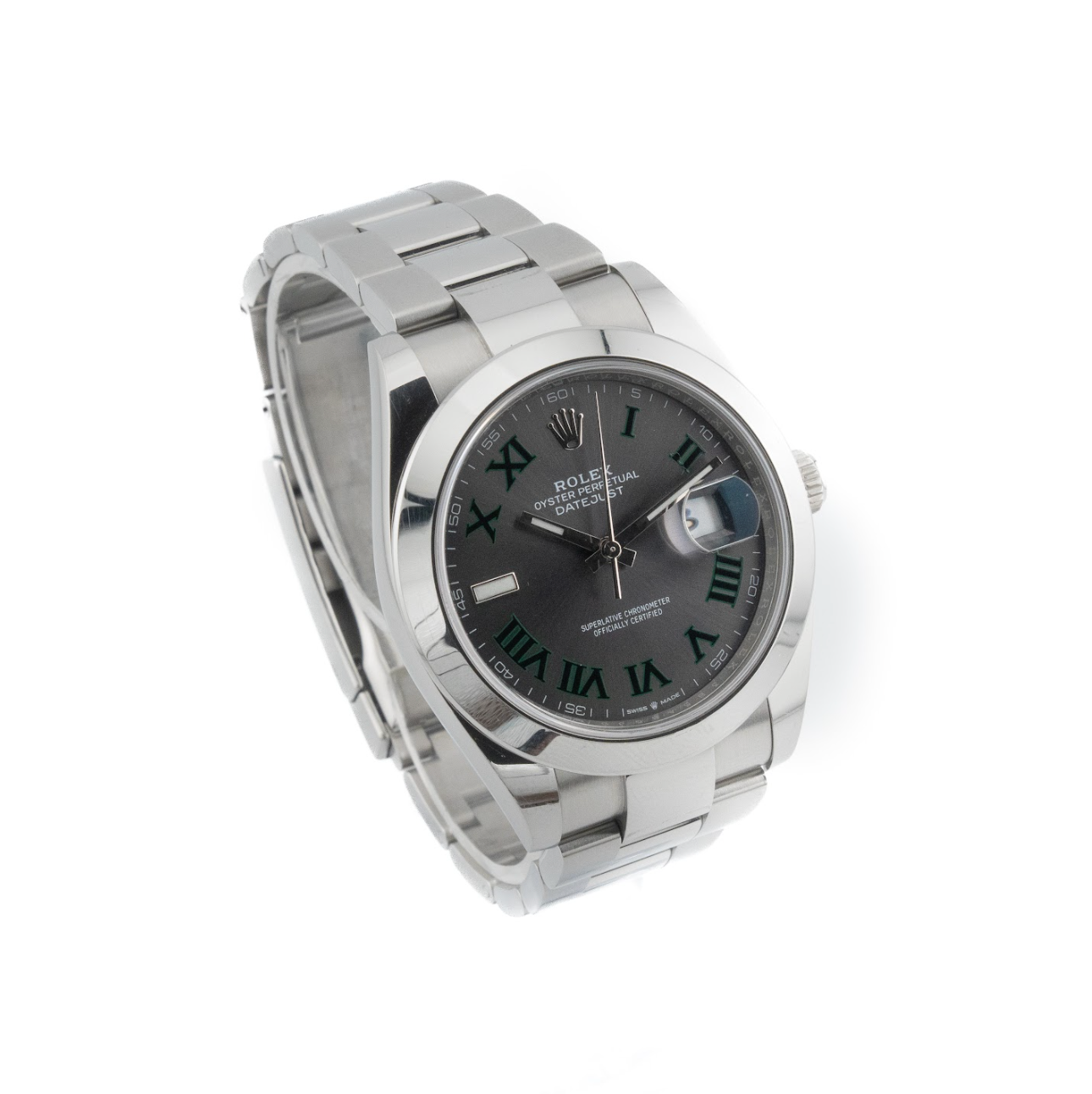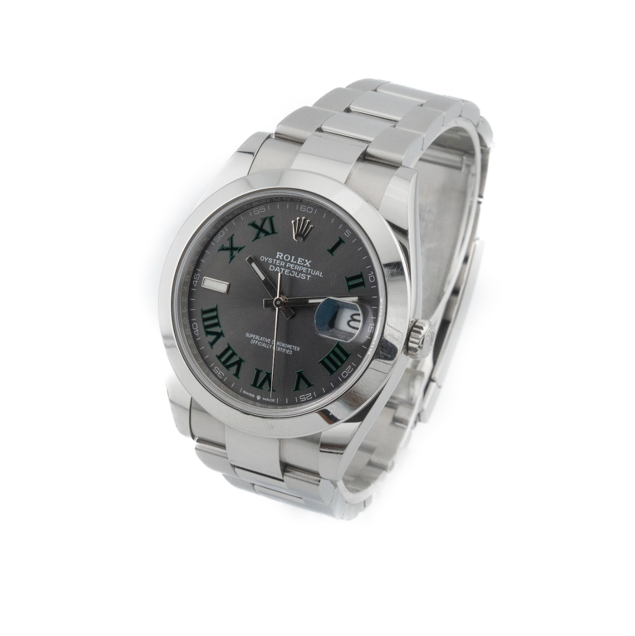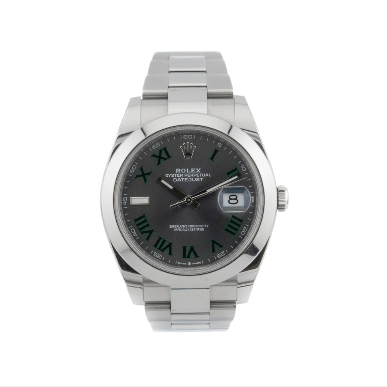 This dial features bold green Roman numerals and a sunray finish that creates dynamic reflections under light, adding depth and visual intrigue. At 3 o’clock, the signature Cyclops lens magnifies the date for easy legibility. Inside, the watch is powered by the Rolex Calibre 3235—a state-of-the-art self-winding movement known for its precision, power reserve of approximately 70 hours, and enhanced reliability. Combining sporty flair with timeless design, the Datejust 41 Wimbledon in smooth steel is a versatile timepiece that bridges everyday wear with iconic Rolex prestige.