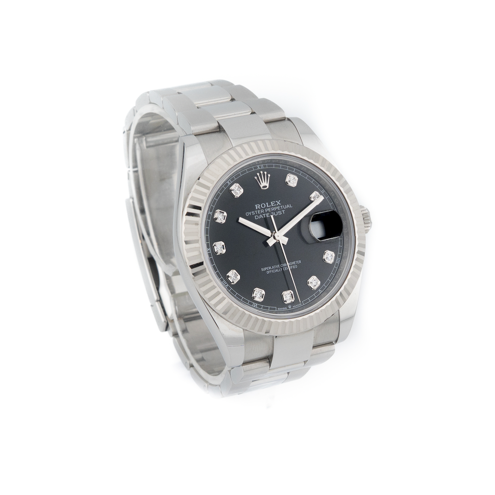 The Rolex Datejust 41 is a distinguished timepiece that embodies elegance and precision. This model features a 41mm Oystersteel case with a striking bright black dial adorned with diamonds, enhancing its luxurious appeal. The Jubilee bracelet, also crafted from Oystersteel, complements the overall design, providing both comfort and style.