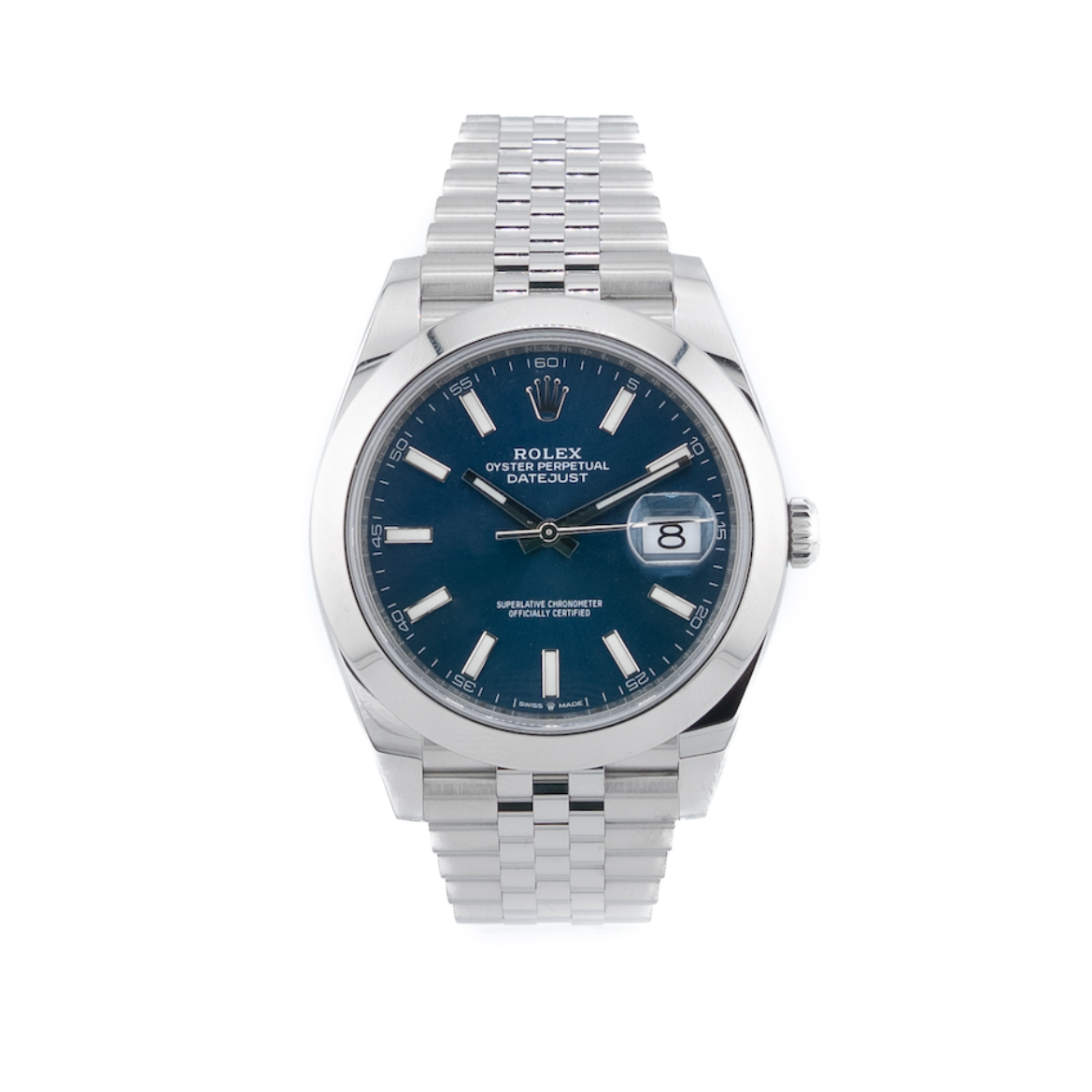 The Rolex Datejust 41 is a timeless expression of elegance and precision, blending classic design with modern innovation. Crafted from Rolex's Oyster Steel this iconic timepiece features a robust 41mm Oyster case that ensures water resistance up to 100 meters. The distinctive smooth bezel, paired with a blue dials and finishes, enhances its refined aesthetic.