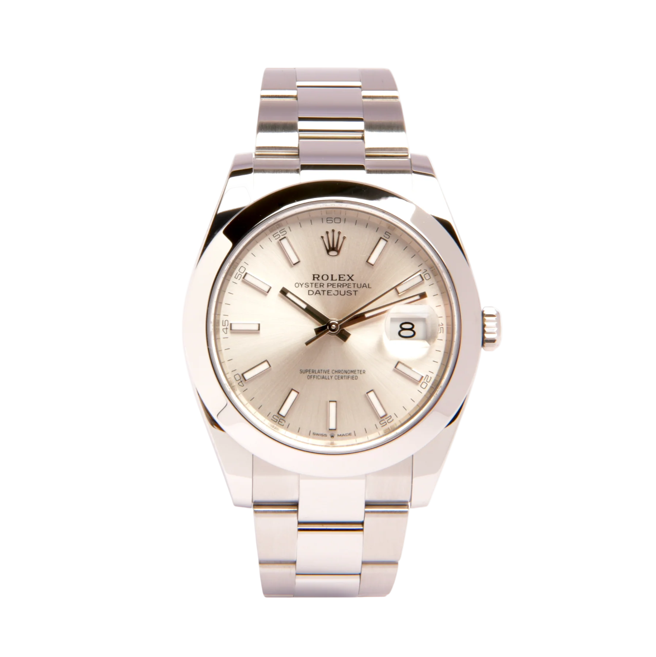 The Rolex Datejust 41 Ref. 126300 in Oystersteel with a silver dial embodies understated elegance and precision. Its 41mm Oyster case, crafted from corrosion-resistant stainless steel, features smooth polished surfaces that reflect Rolex’s refined craftsmanship. The silver sunray-finished dial offers a clean, contemporary look, enhanced by applied hour markers and the signature date window at 3 o’clock beneath the Cyclops lens.