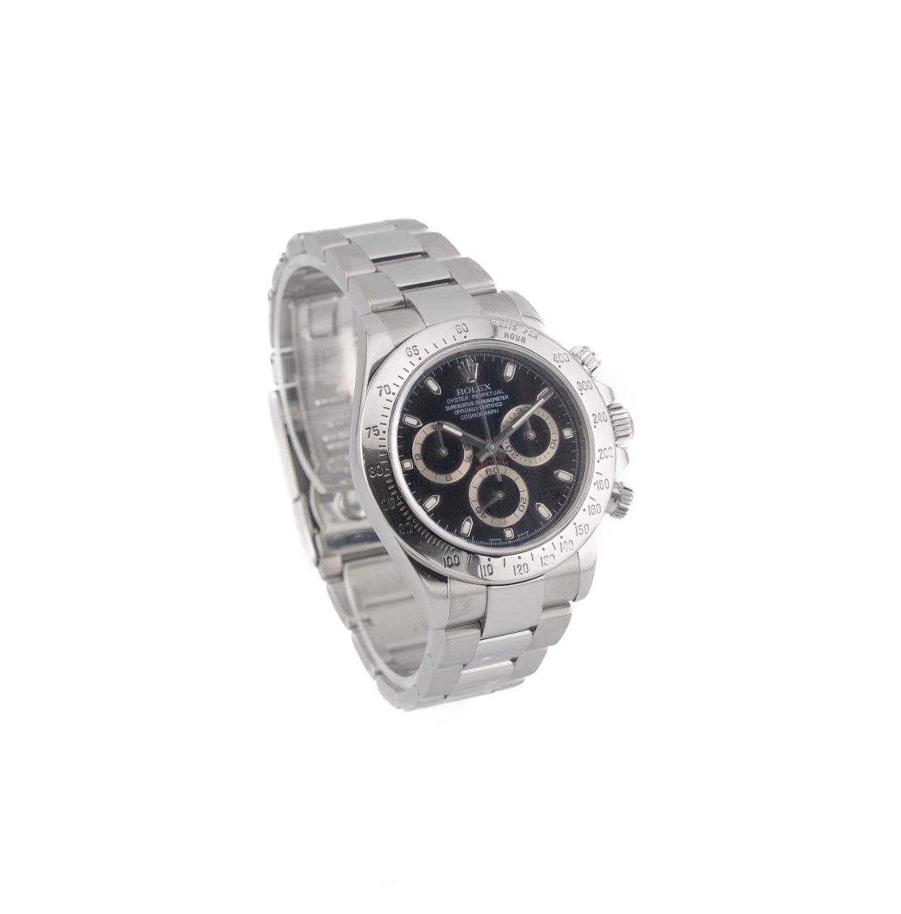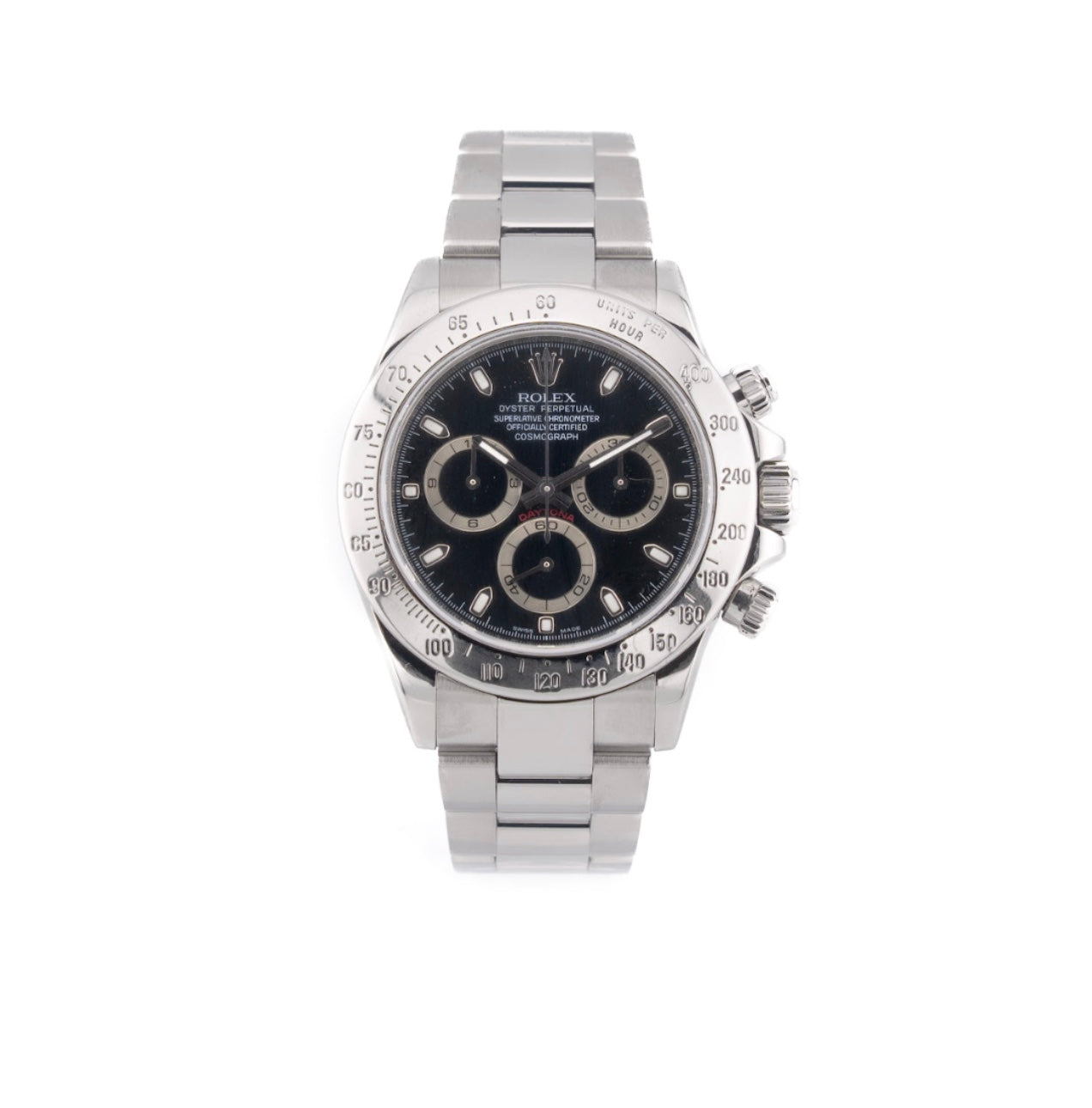 The Rolex Cosmograph Daytona Ref. 116520 in black is a highly sought-after discontinued model, crafted in durable 904L stainless steel with a 40mm case and high-contrast black dial featuring polished silver subdials ("CD Rings").