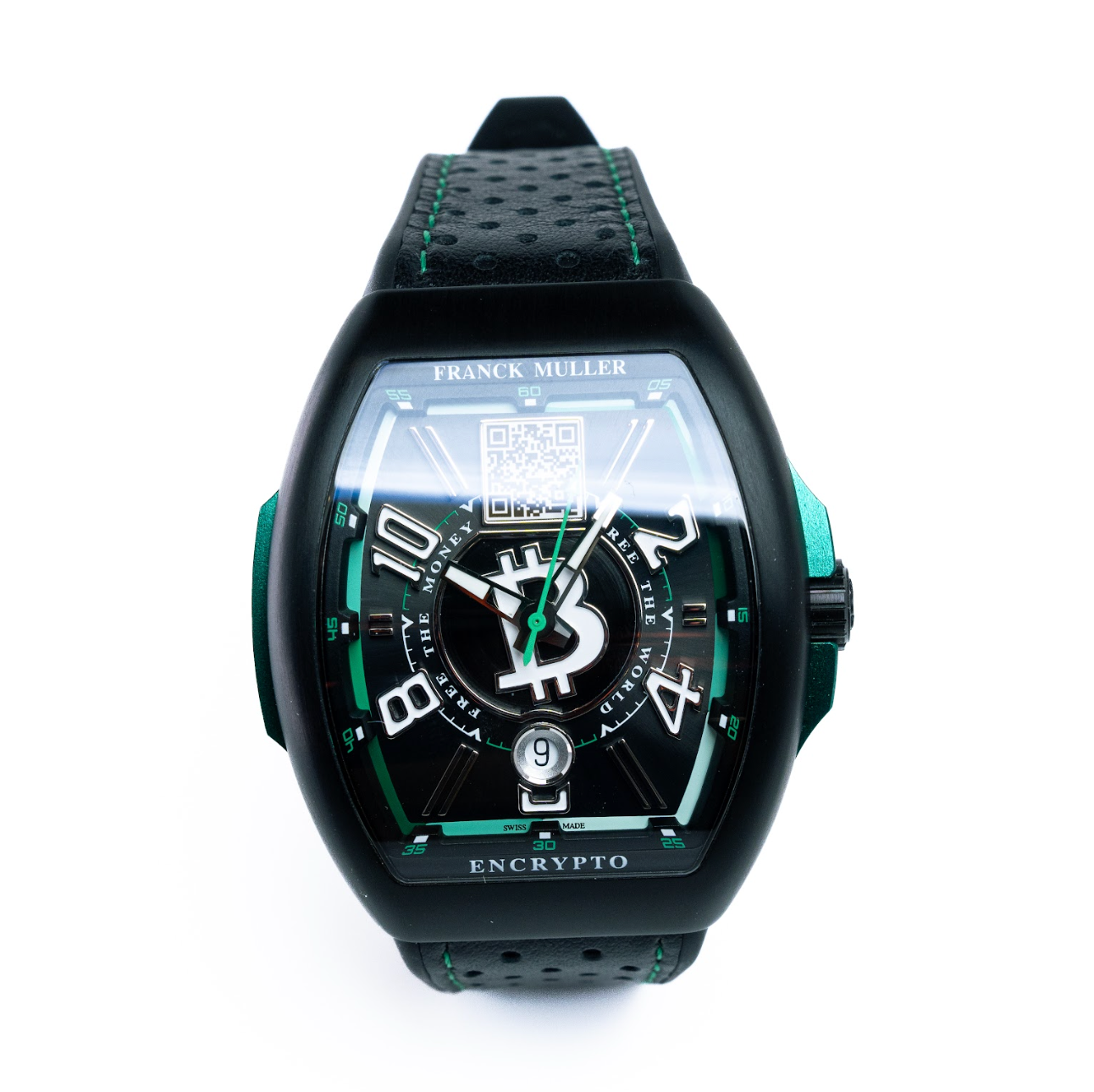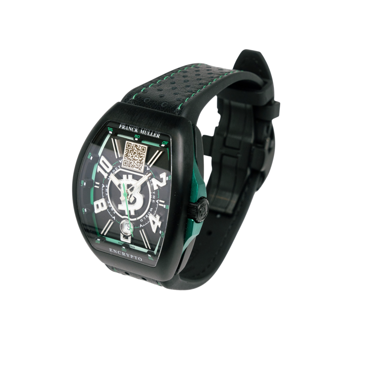 The Franck Muller Vanguard Encrypto is "the world's first functional Bitcoin watch," featuring a laser-etched QR code on the dial for a public wallet address that can be used to deposit Bitcoins and check the balance of the account. This limited edition timepiece combines Franck Muller's signature tonneau-shaped case with revolutionary cryptocurrency functionality, with a rubberised strap offers a different look.