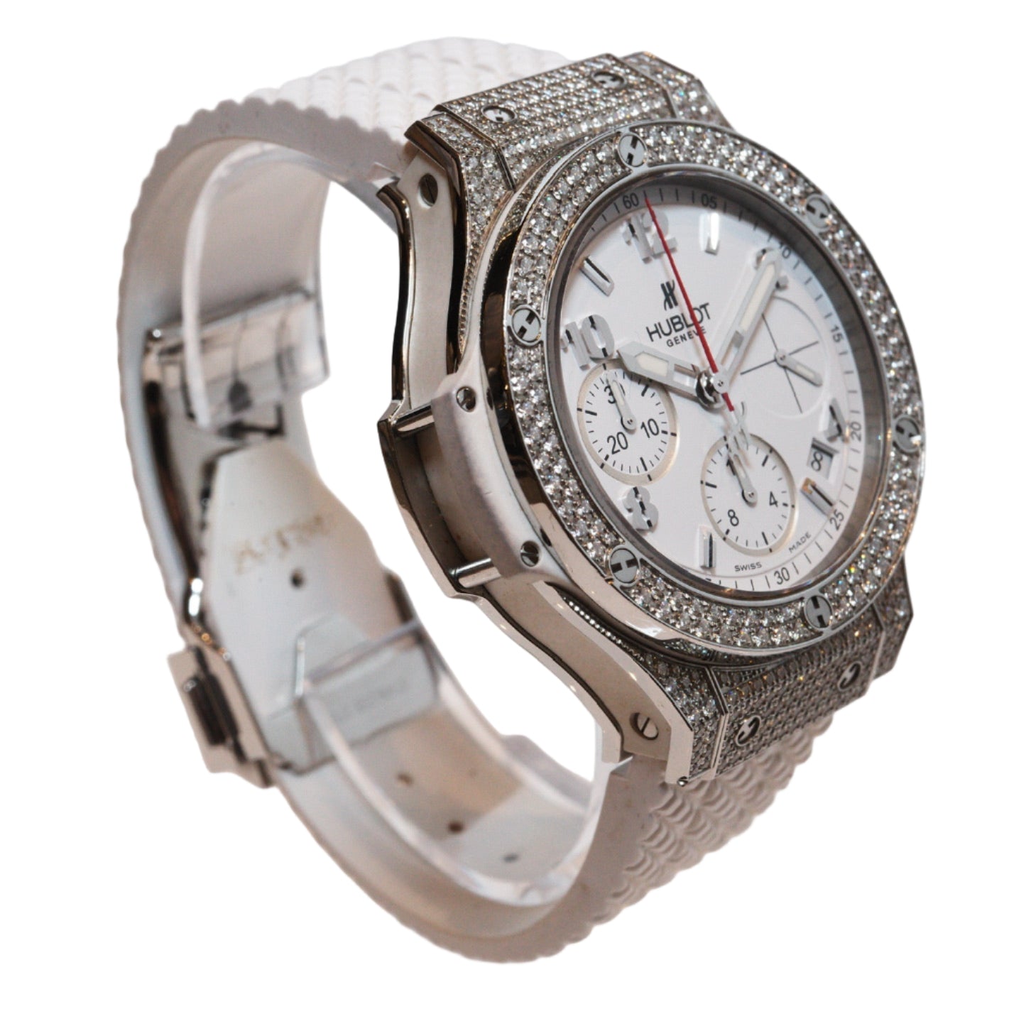 The Hublot Big Bang 342.SE.230.RW.174 is a 41 mm luxury chronograph that blends sporty design with high-jewellery refinement. Its polished stainless-steel case and bezel are fully set with sparkling brilliant-cut diamonds, creating a striking contrast against the crisp white dial. The dial features bold Arabic numerals, three chronograph subdials, and a discreet date display, all protected by sapphire crystal.