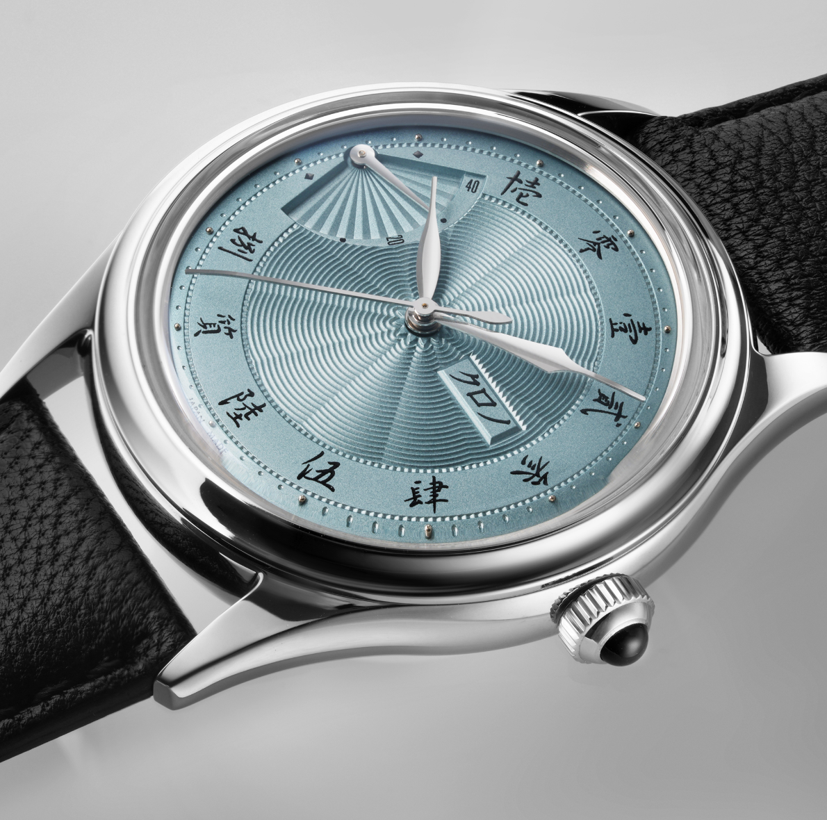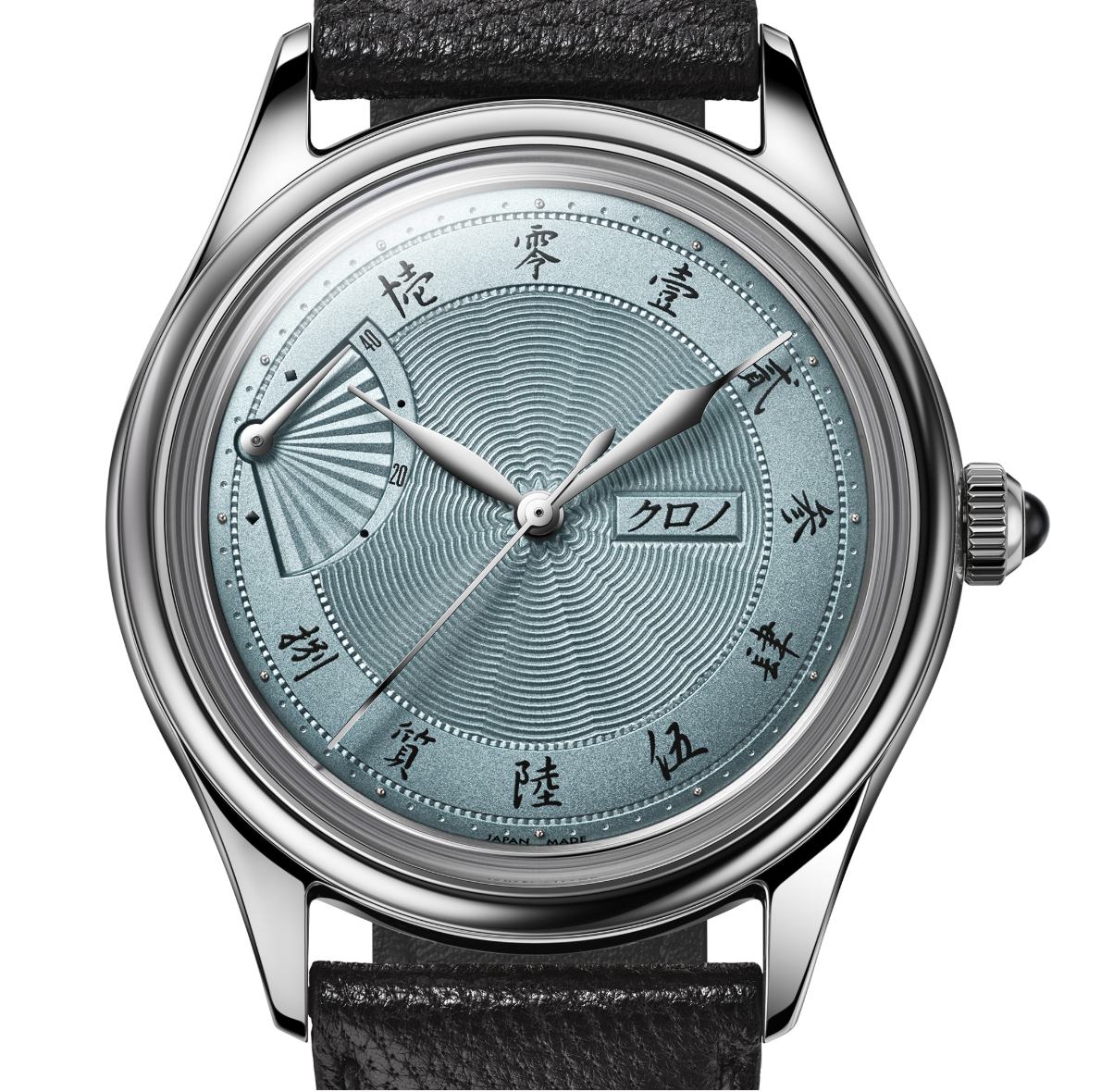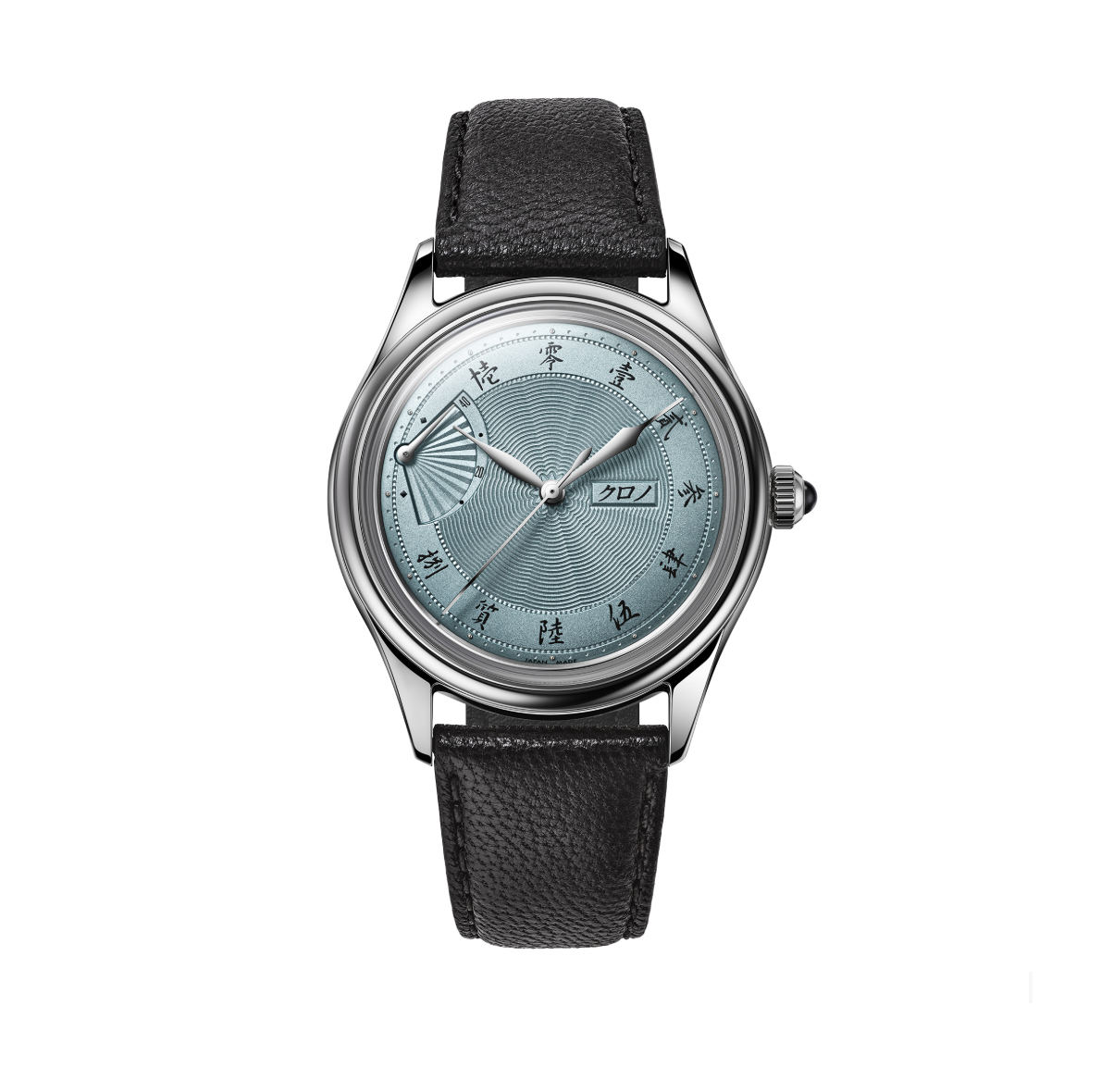 Hajime Asaoka’s Réserve de Marche ‘Sensu NOS’ returns in rare metallic baby blue 白藍 (Shiraai), featuring a silver-plated guilloché dial with Kanji hour markers and Sensu fan power-reserve. Powered by a discontinued cal.9133 movement and crowned with black onyx for his 60th Diamond Jubilee, the dial’s soft lacquer evokes traditional Japanese Aizome indigo, making this a truly rare collector’s piece.