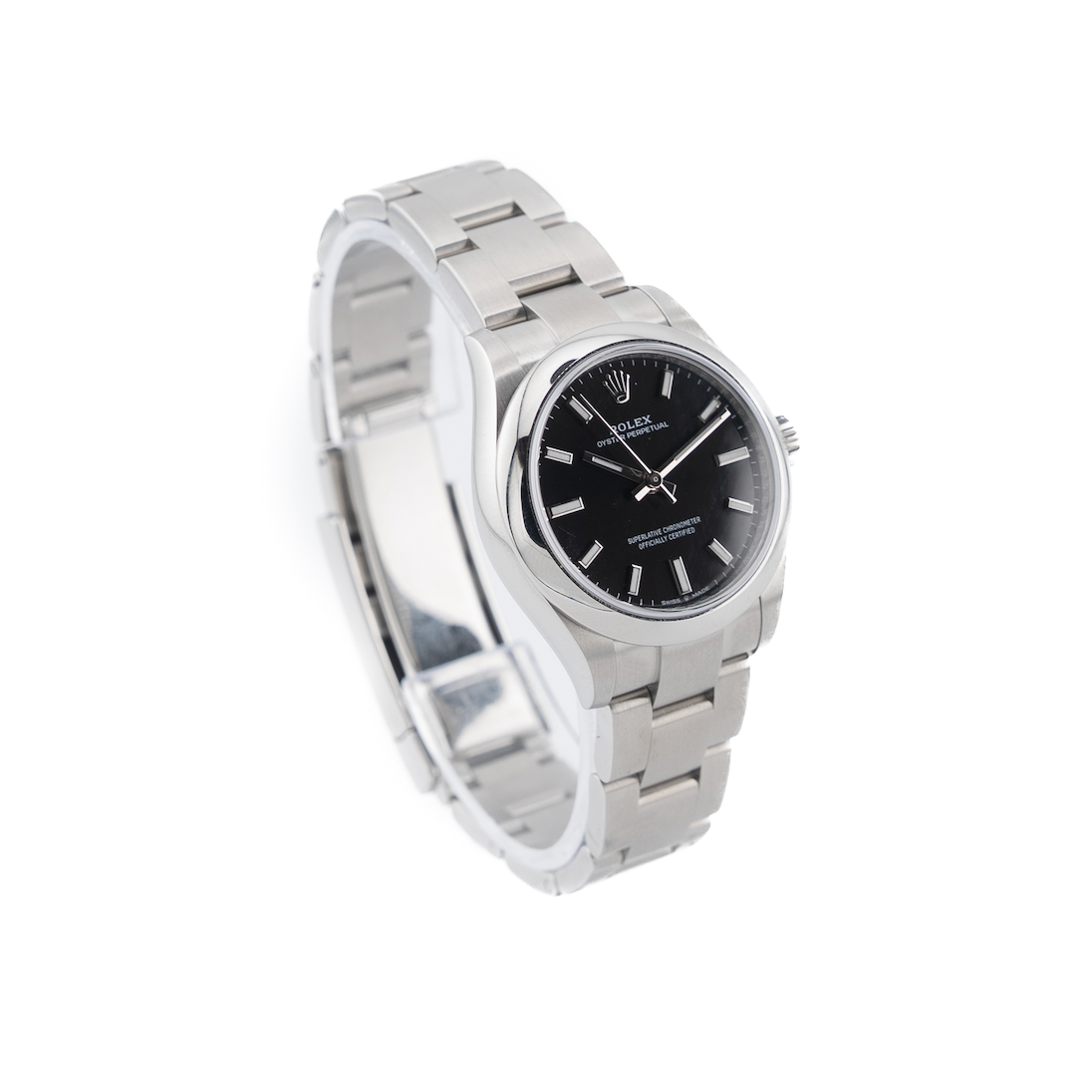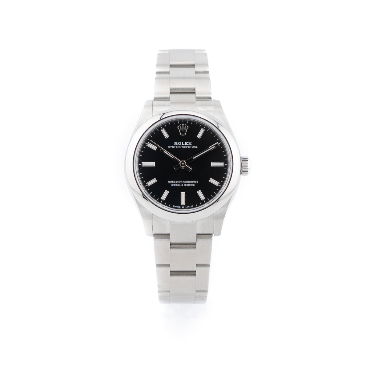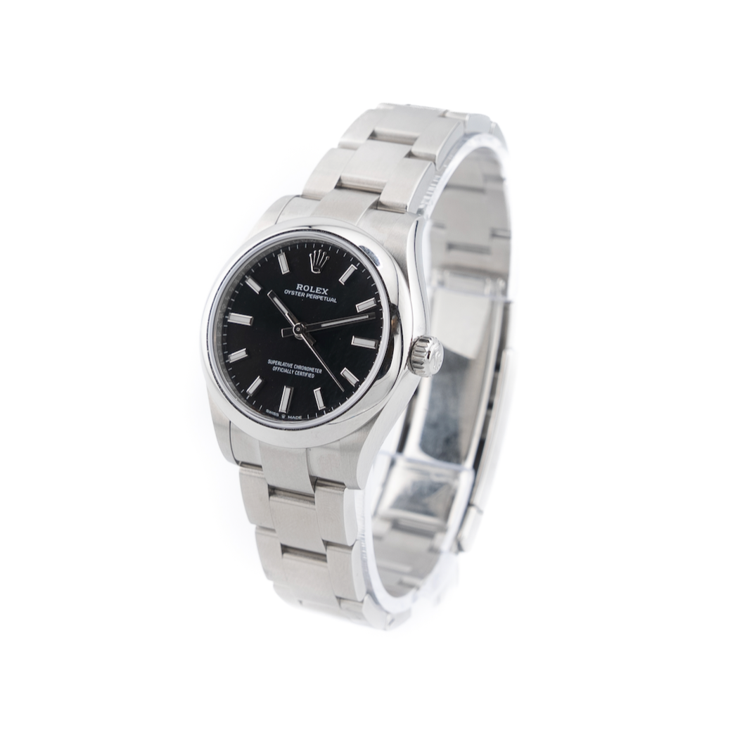 The Rolex Oyster Perpetual 31 in black is a refined blend of simplicity, precision, and enduring style. Its 31 mm Oystersteel case offers a balanced presence on the wrist, showcasing Rolex’s signature durability and polished elegance. The deep black dial, smooth and minimalist, enhances legibility with its clean baton hour markers and the iconic crown at twelve o’clock.