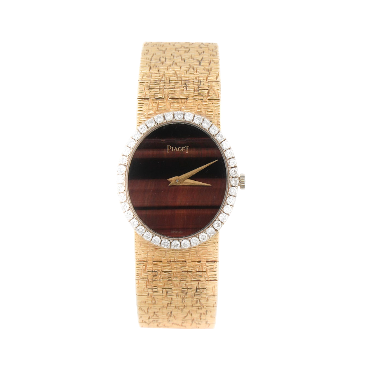 The Piaget Diamond Tiger Eye Vintage Cocktail, reference 9826-A-6, is a striking expression of Piaget’s artistry in both watchmaking and jewelry. Crafted in 18k yellow gold, the watch radiates warmth and elegance, enhanced by a mesmerizing tiger’s eye dial that shimmers with natural golden-brown striations unique to the stone. A delicate halo of brilliant-cut diamonds frames the dial, adding a refined sparkle that balances the bold character of the gemstone.