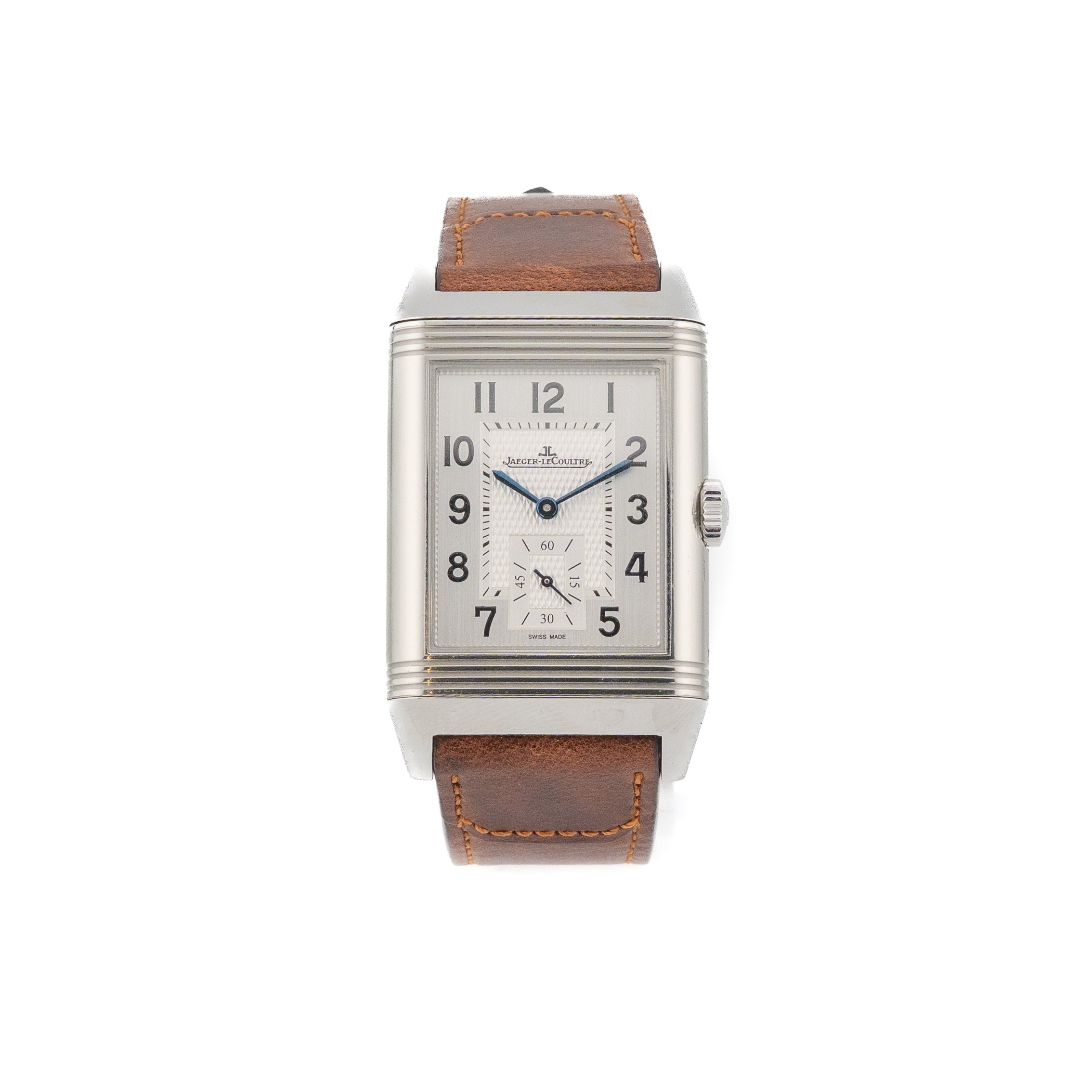 The design of the Reverso Classic Large Small Seconds timepiece in steel is emblematic of the Reverso collection. Reflecting the finishes of the dial in miniature, the small second dial offers a second level of reading. It is dressed in a calfskin strap from the Fagliano Collection.