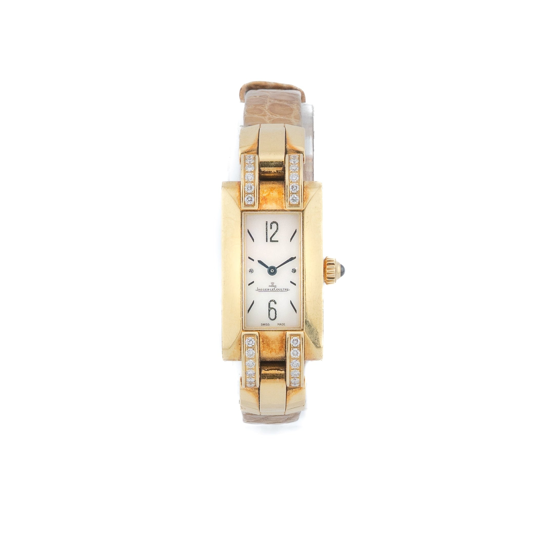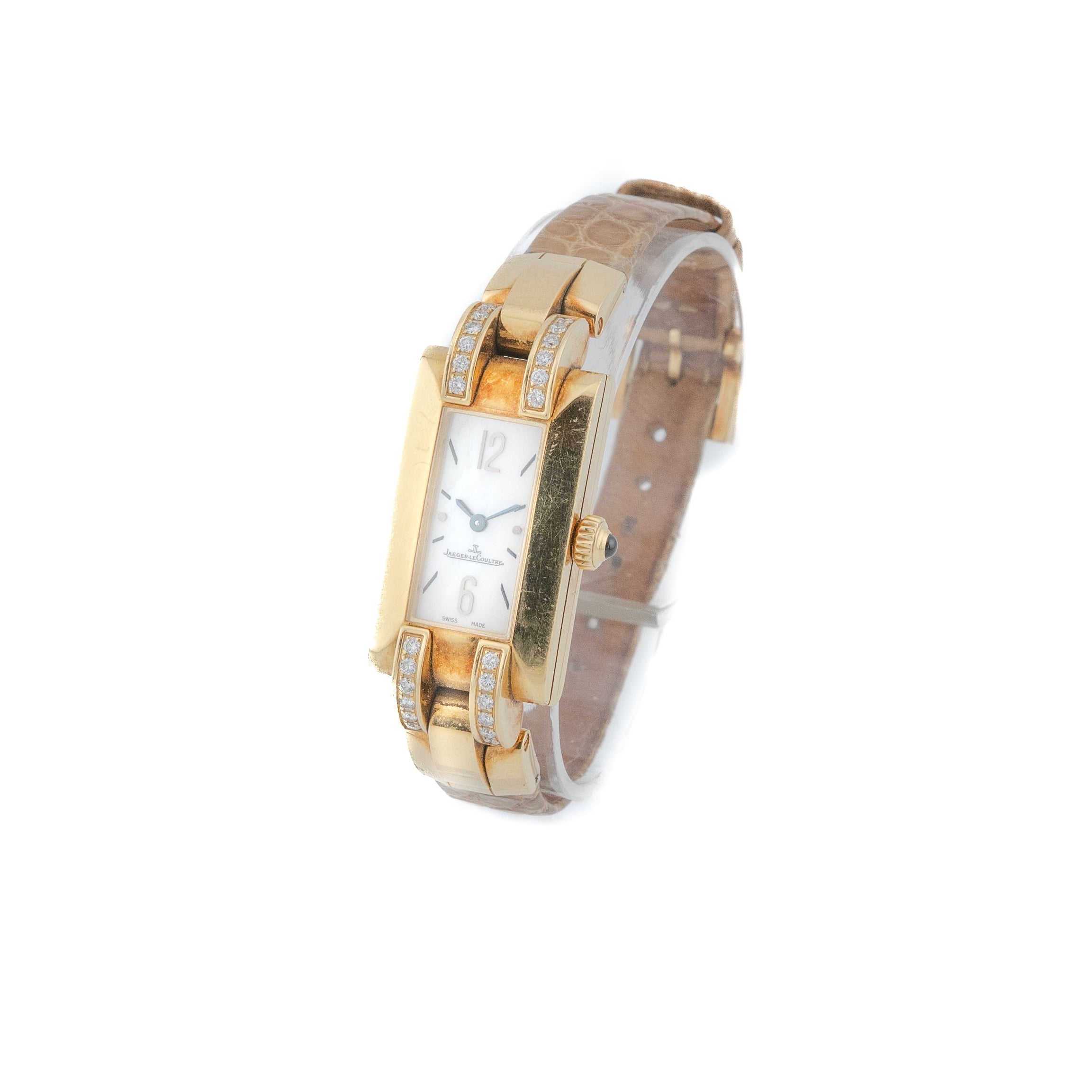 This Jaeger-LeCoultre Idéale is a stunning blend of classic elegance and refined design — a watch that feels like wearable art. Encased in luxurious 18 k yellow gold, its sleek, vertically elongated profile is both graceful and eye-catching. The luminous mother-of-pearl dial adds a soft, iridescent glow that catches the light beautifully and brings a touch of natural radiance to your wrist.