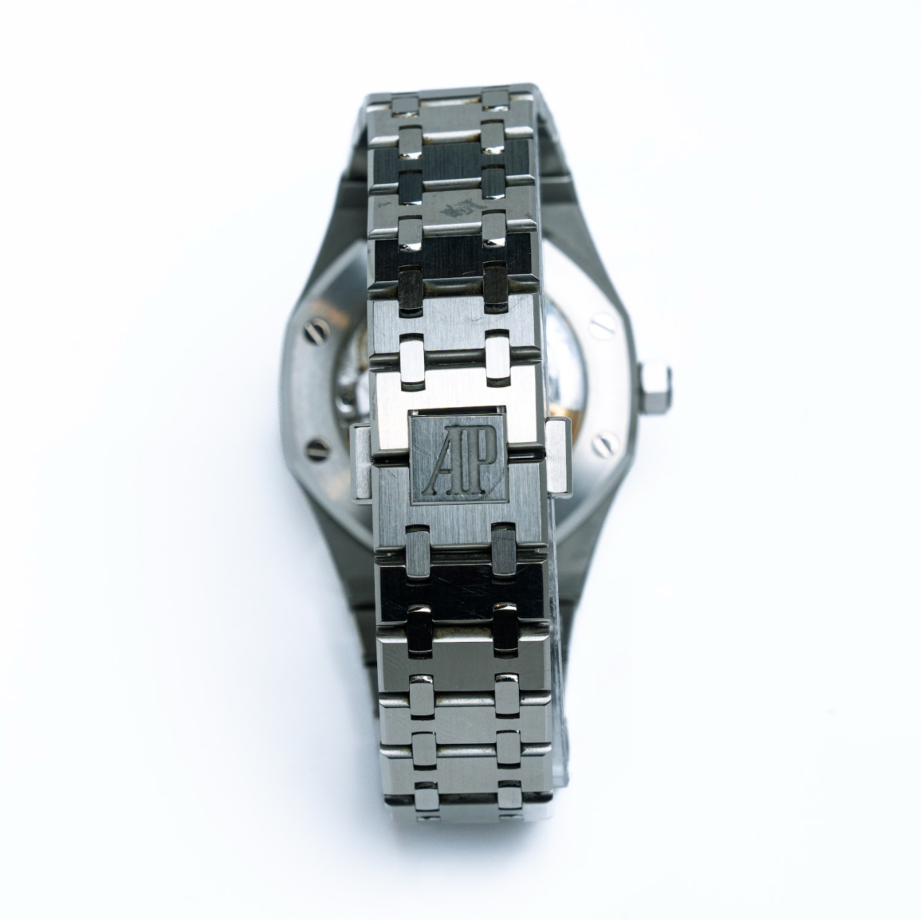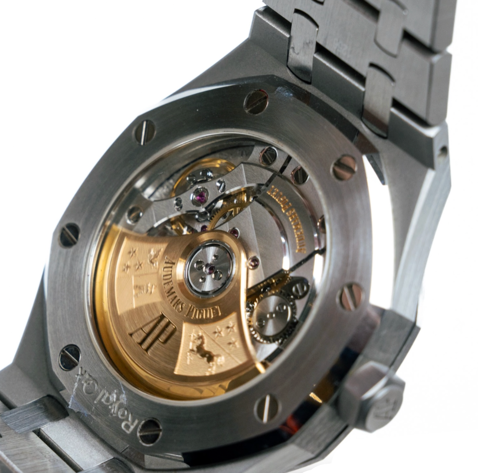 Inside, the watch is powered by the Audemars Piguet Caliber 3120, a self-winding mechanical movement known for its precision and reliability. The 3120 movement offers a power reserve of 60 hours, and it features a date complication at 3 o’clock. The watch is fitted with the signature stainless steel bracelet, which perfectly complements the case, and includes a folding clasp for a secure and comfortable fit on the wrist.
