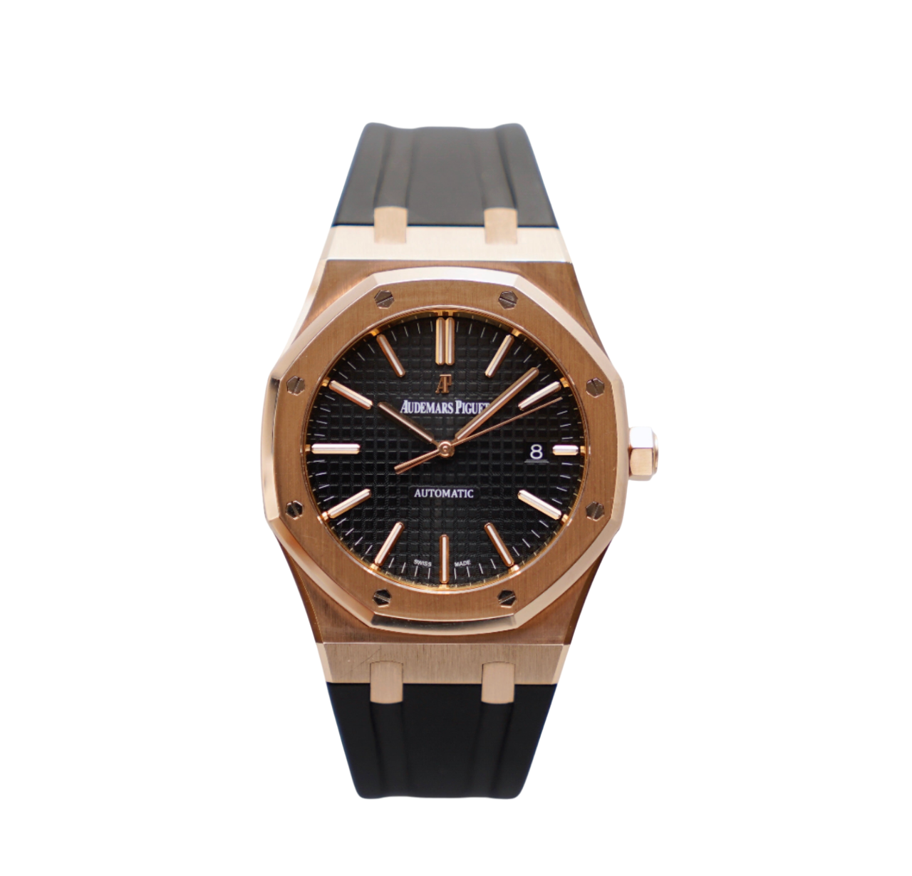 Pink gold applied hour-markers and Royal Oak hands with luminescent coating |