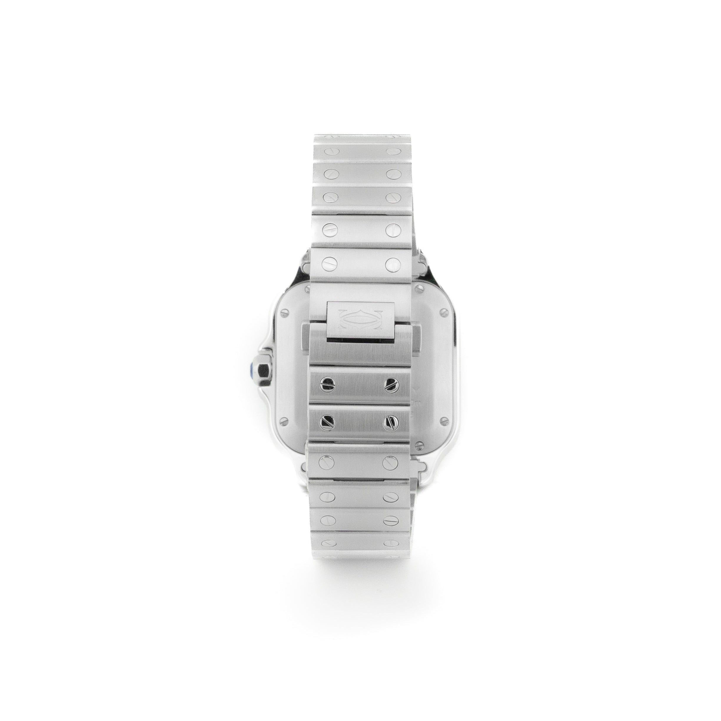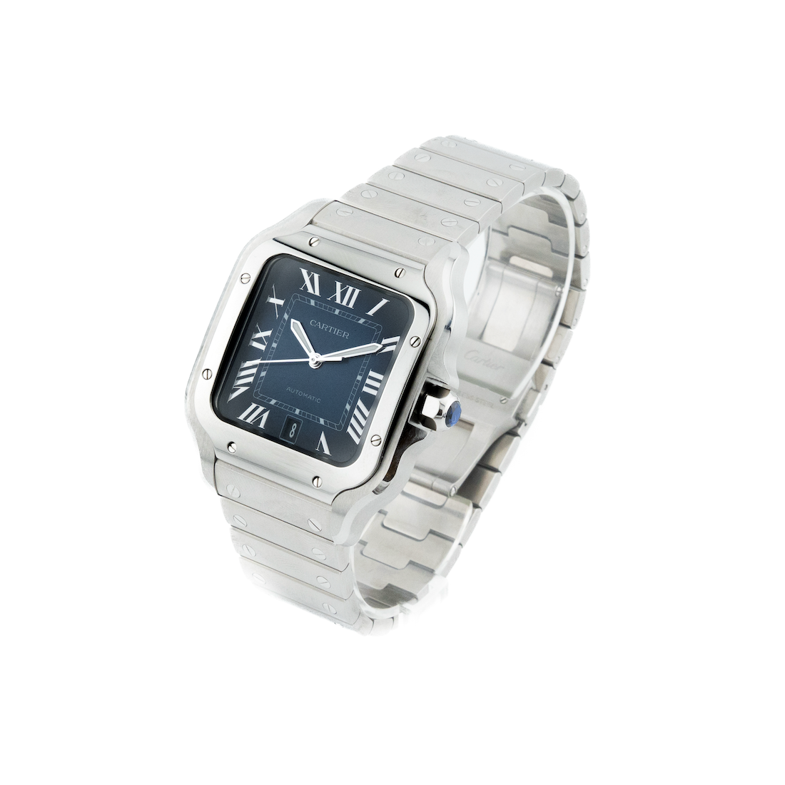 Santos watch, large model, mechanical movement with automatic winding, calibre 1847 MC. Steel case, 7-sided crown set with a faceted synthetic spinel, graduated blue dial, steel sword-shaped hands, sapphire crystal. Steel bracelet with "SmartLink" adjustment system. Second bracelet in navy blue calfskin, with interchangeable steel folding buckle. Both are fitted with the "QuickSwitch" interchangeable system. Case width: 39.8 mm, thickness: 9.38 mm. Water-resistant to 10 bar (approx. 100 metres).