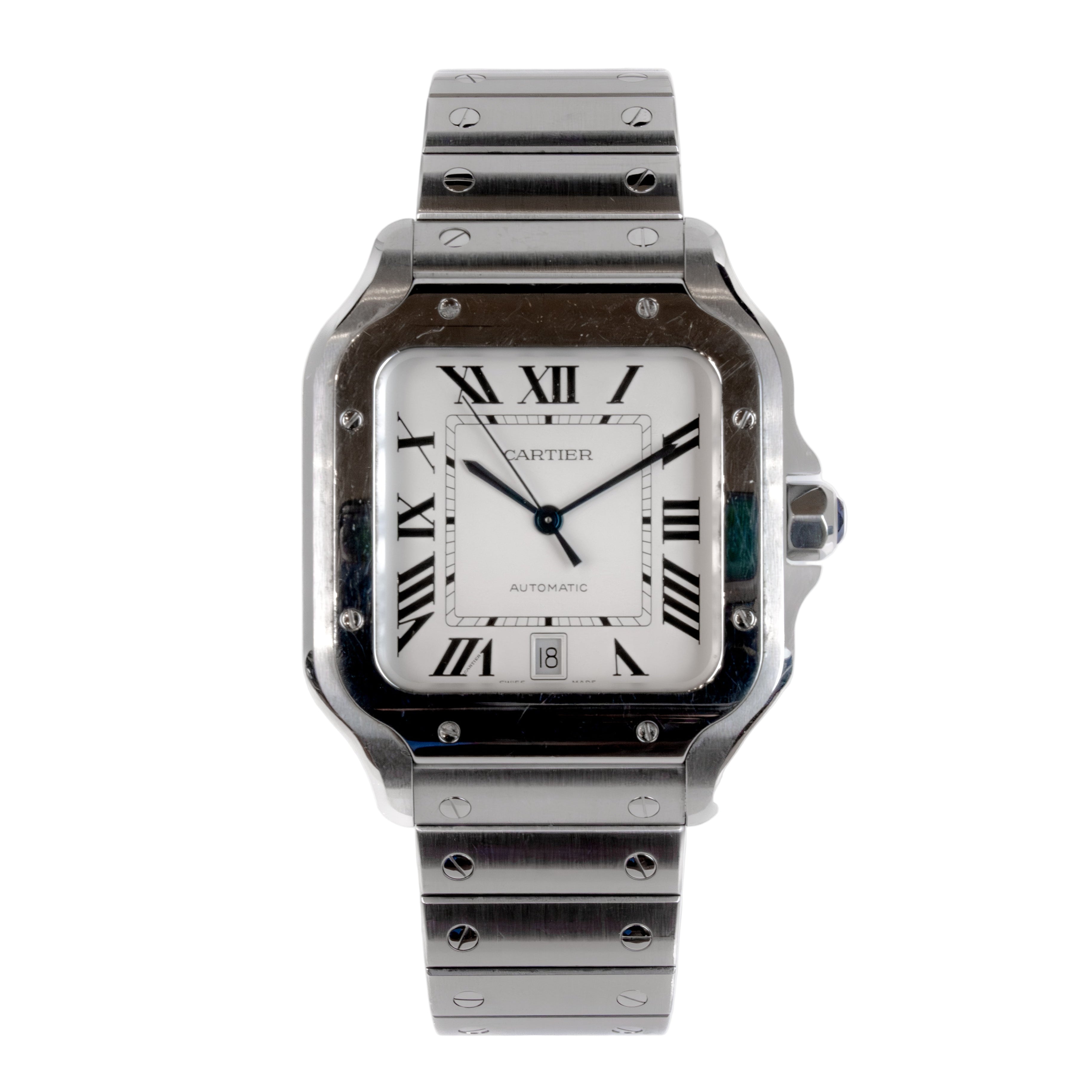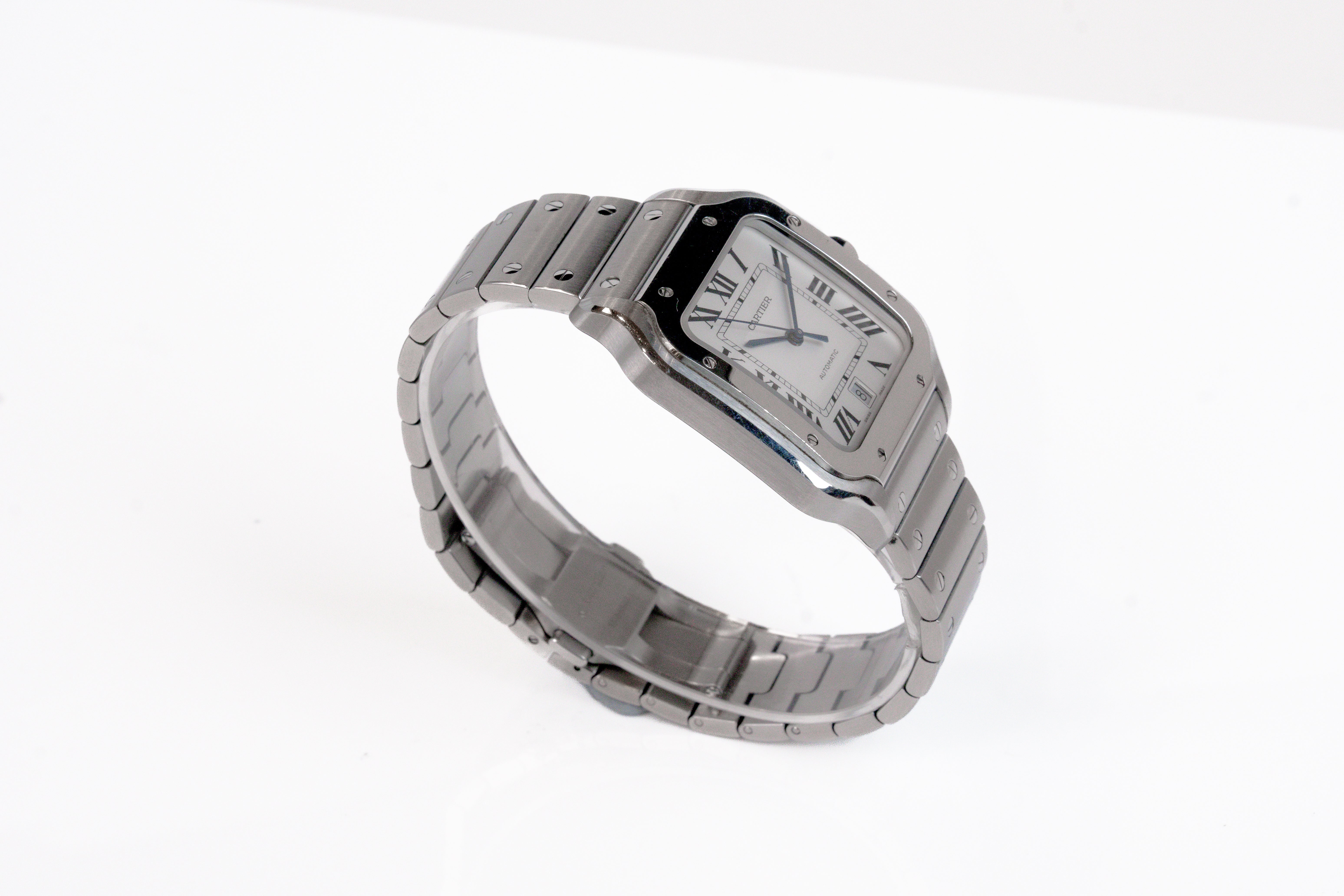 The Santos de Cartier Medium presents the Maison’s emblematic design in a refined, everyday form. A 35.1 mm stainless‑steel case with a signature seven‑sided crown set with a faceted synthetic spinel frames a crisp white opaline dial. The self‑winding 1847 MC calibre is secured beneath a sapphire crystal, delivering reliable precision in a slim 8.83 mm profile with 3‑bar (30 m) water‑resistance. Supplied with a stainless‑steel bracelet and an additional calfskin strap, each with an interchangeable steel folding buckle, it transitions seamlessly from professional to casual settings—elegant, versatile, and unmistakably Cartier. This watch is in like-new condition with full box and papers from 2022