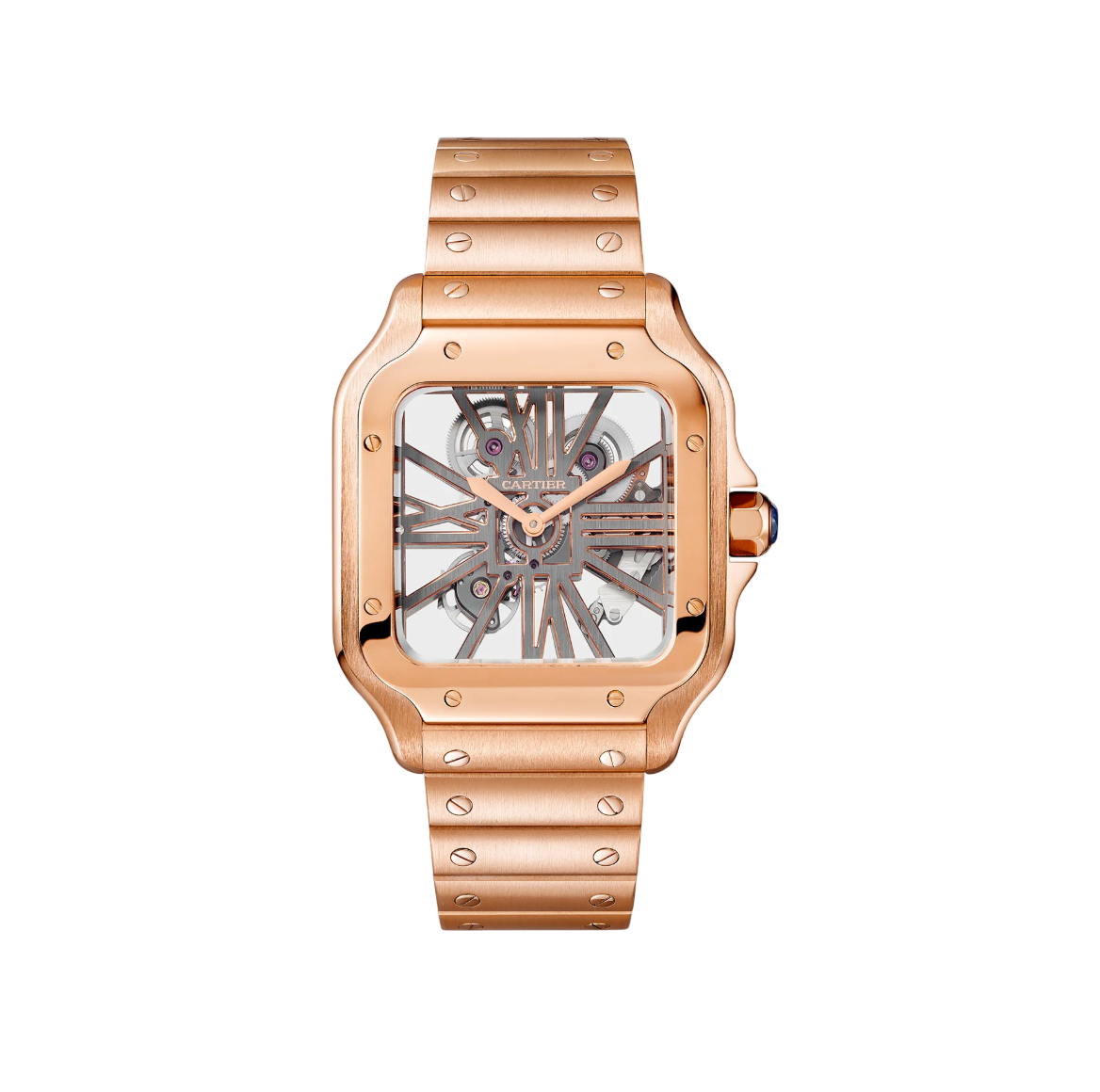 The Cartier Santos de Cartier Skeleton Large Model in 18K rose gold showcases the brand’s signature elegance and technical mastery.