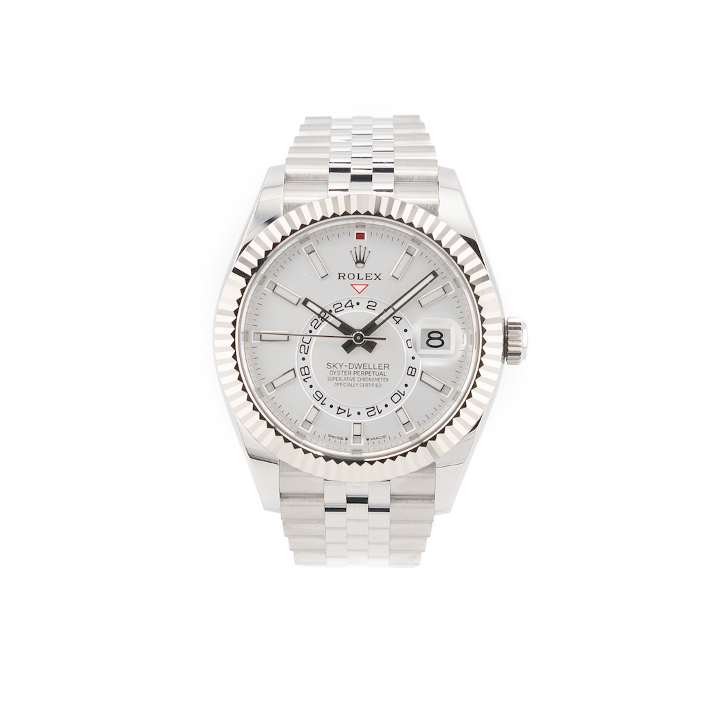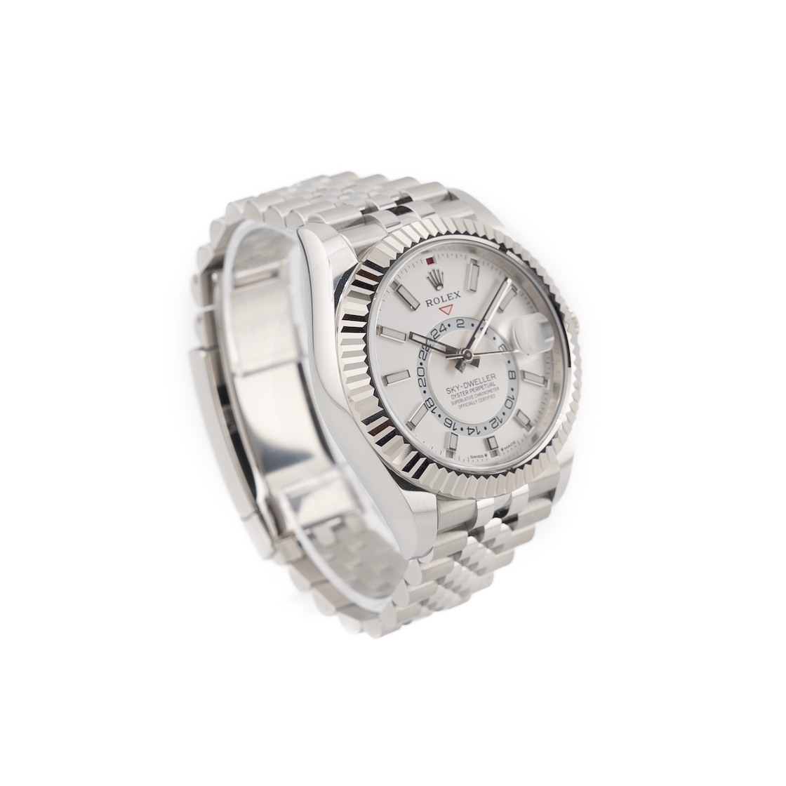 The Rolex Sky-Dweller Ref. 336934 (2025) combines elegant design with advanced functionality. Crafted from Oystersteel and 18 ct white gold, it features a white dial, fluted bezel, and Jubilee bracelet.