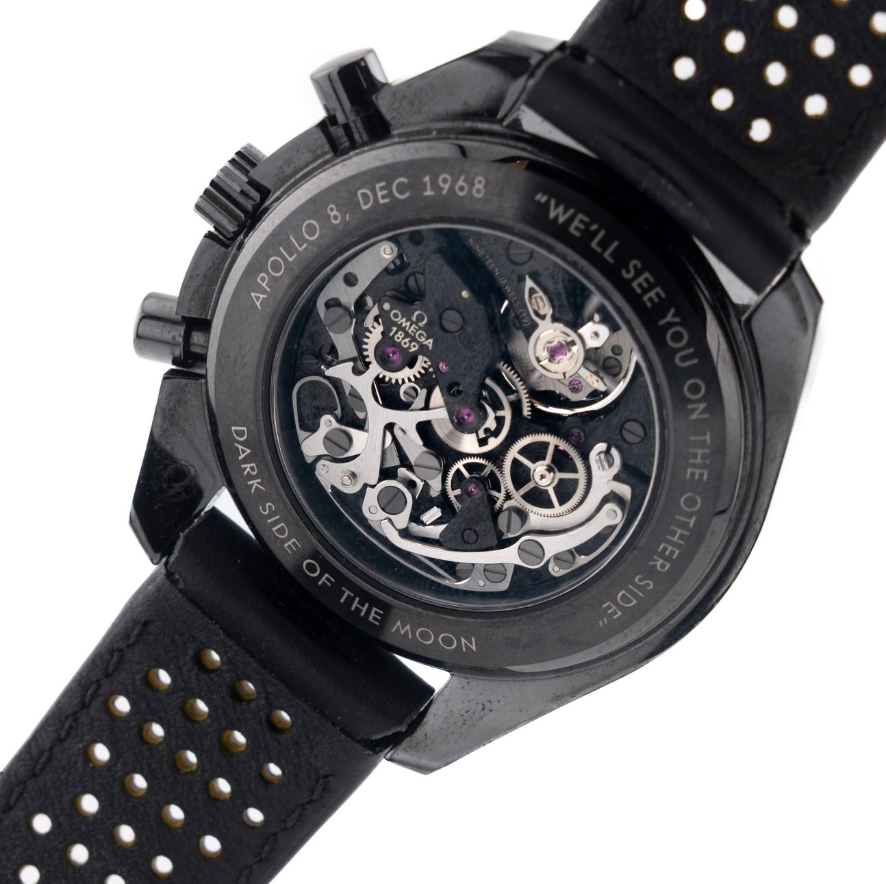 The specially decorated movement is the OMEGA Co-Axial Master Chronometer Calibre 3869, while the engravings on the caseback include “APOLLO 8, DEC 1968”, “DARK SIDE OF THE MOON”, “WE’LL SEE YOU ON THE OTHER SIDE”, and "CO-AXIAL MASTER CHRONOMETER".