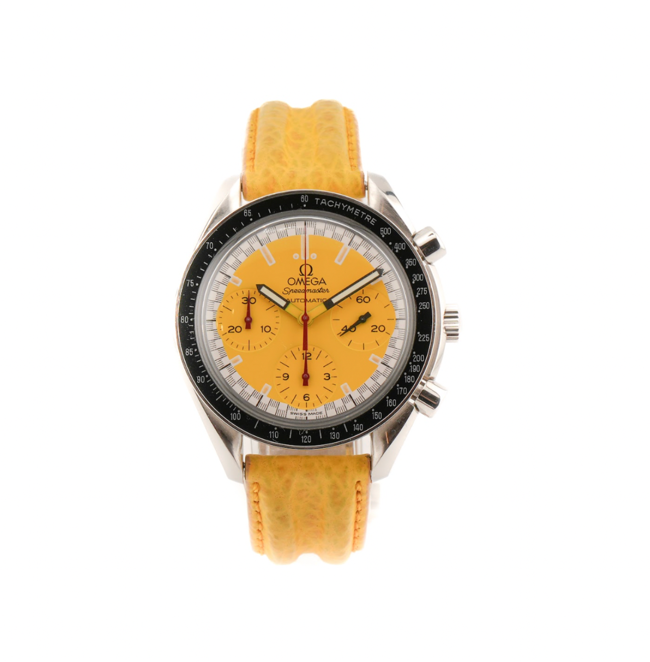 The Omega Speedmaster Reduced “Michael Schumacher” Edition in yellow is a bold and energetic take on the iconic Speedmaster design, infused with motorsport flair. Released in the mid-1990s to celebrate Formula 1 legend Michael Schumacher, this 39mm stainless-steel chronograph stands out with its vivid yellow dial—often referred to as “Schumacher Yellow”—and contrasting black tachymeter bezel. The dial features crisp white sub-dials, luminous hands, and markers for enhanced legibility, while the outer ring’s subtle checkered pattern nods to the world of racing.