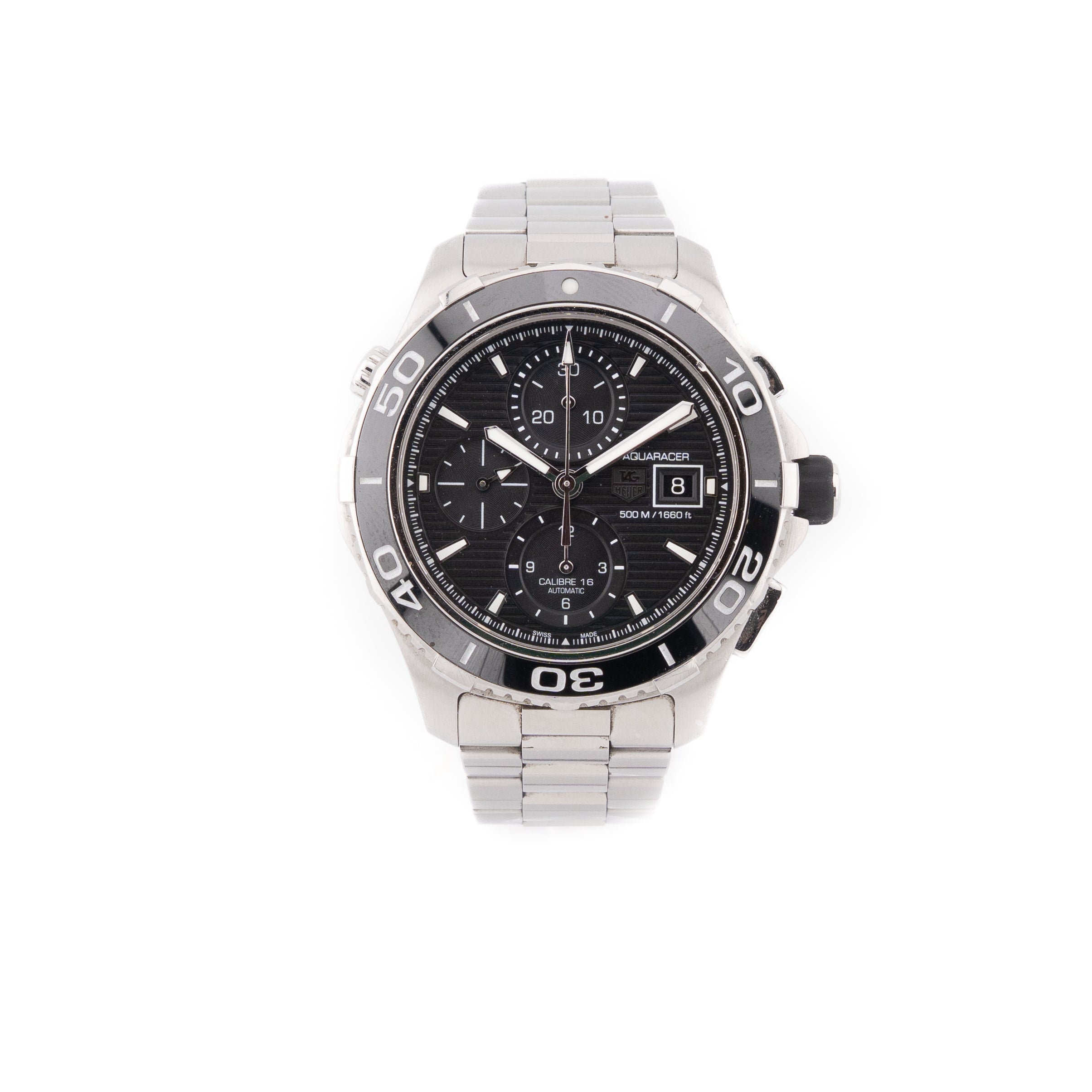 A 43mm quartz chronograph with full professional diving features. Heuer’s link to the high-pressure world of watersports began in 1895, the year it patented its first water-resistant case. The rugged, go-anywhere Aquaracer continues the legacy.