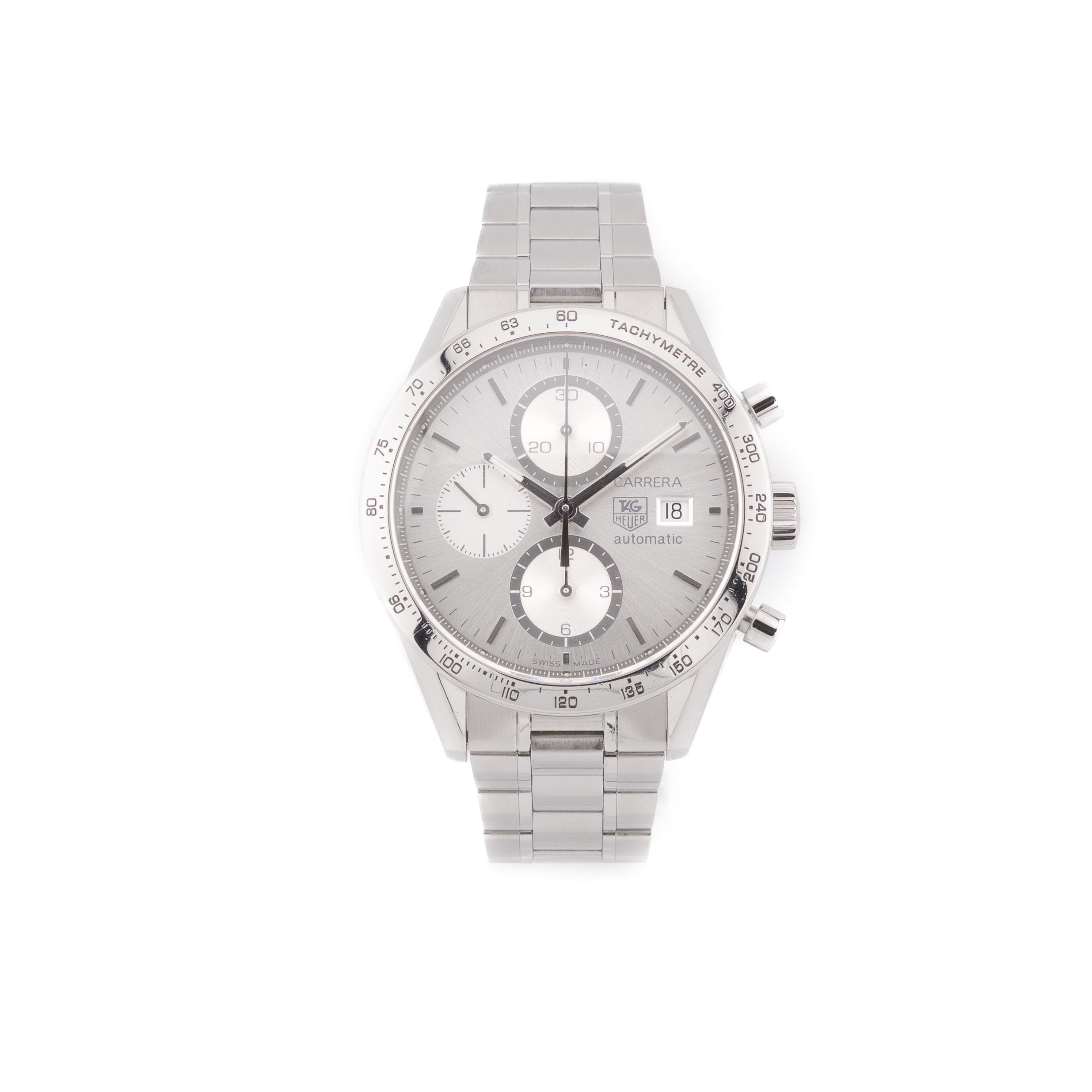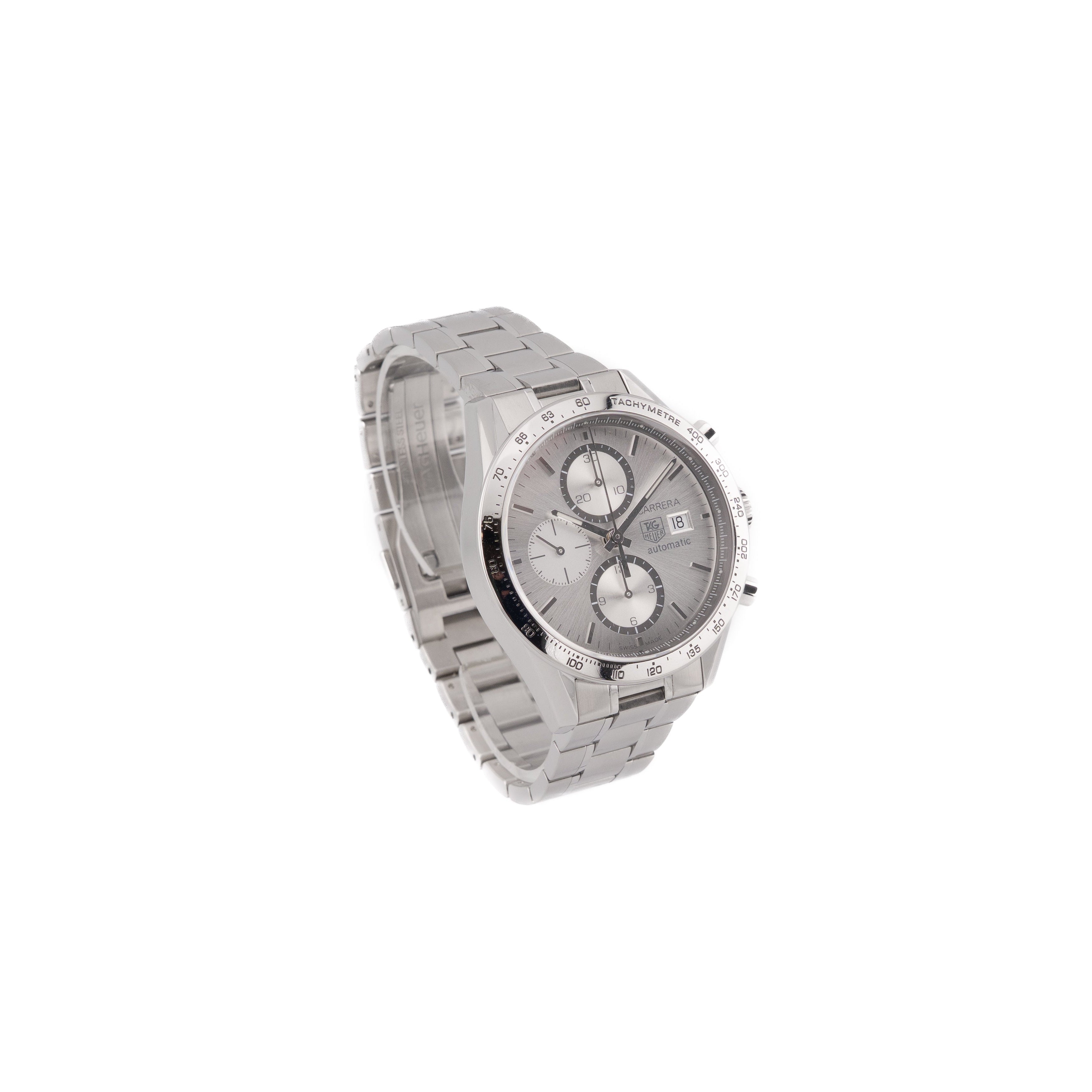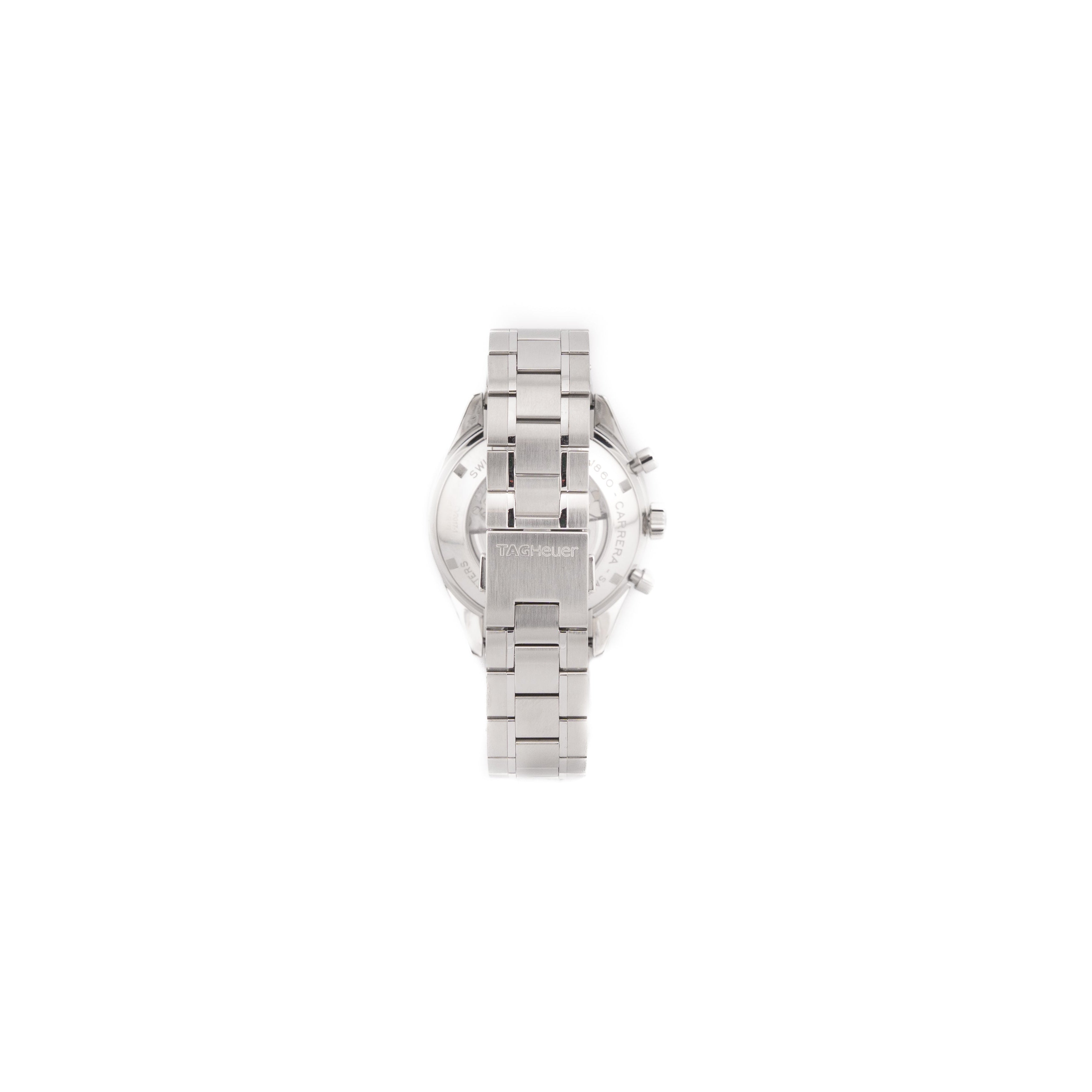 Its silver dial, protected by sapphire crystal, presents a classic Carrera layout with luminous hands, chronograph sub-dials, small seconds, a date display, and a tachymeter scale for timing precision.