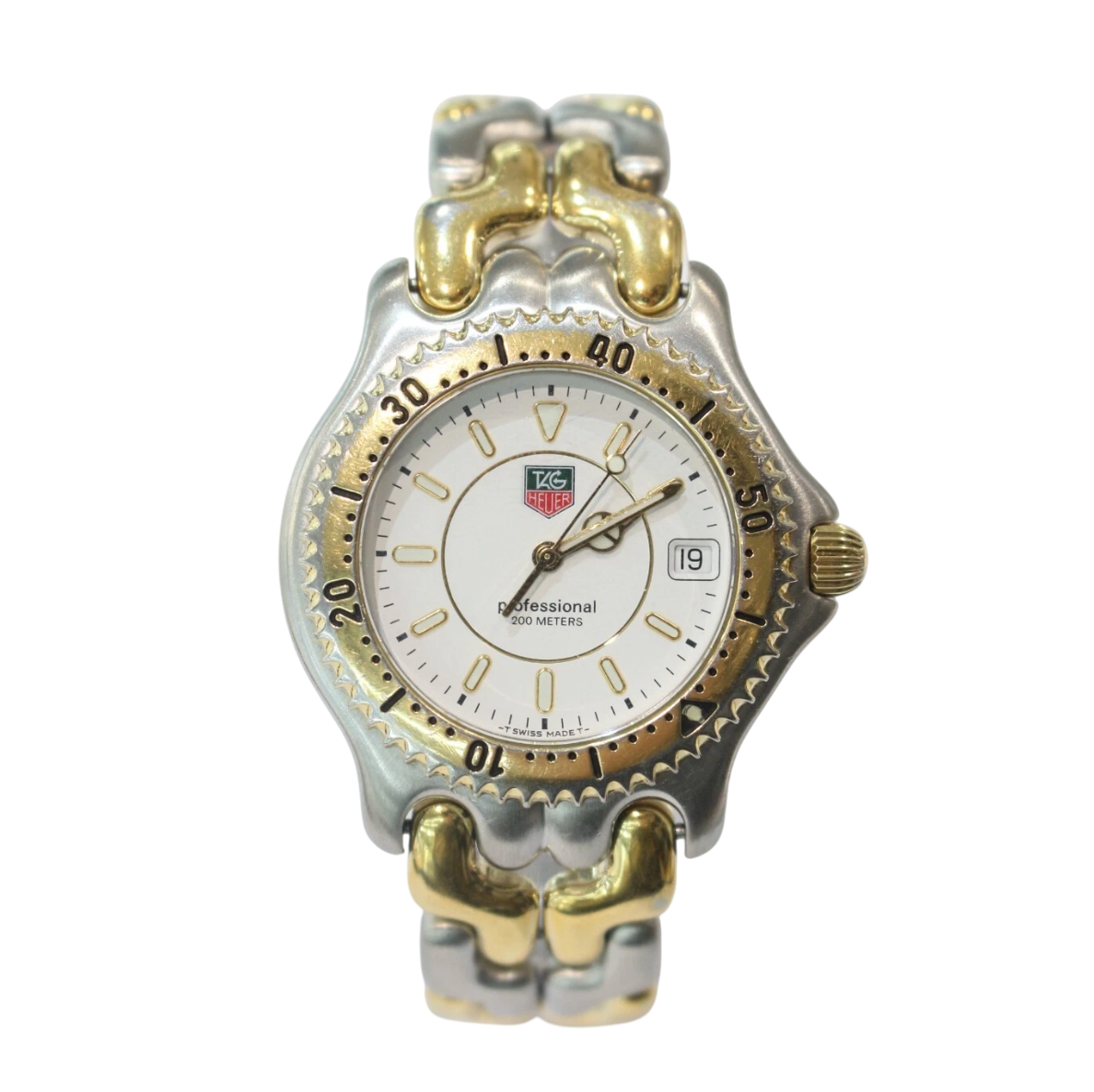 Sporty yet refined, the TAG Heuer Professional Series 200m WG1122 is a versatile two-tone classic designed for all occasions. Its 38 mm stainless steel case with satin finish is paired with a gold-plated unidirectional bezel and matching two-tone bracelet, balancing rugged functionality with elegant styling. The crisp white dial features luminous hour markers, gold-accented Mercedes hands, and a date display at 3 o’clock, protected by sapphire crystal. Powered by a Swiss quartz movement, this Professional Series delivers reliable precision, while the screw-down crown and 200 m water resistance ensure it’s ready for both everyday wear and adventurous pursuits.