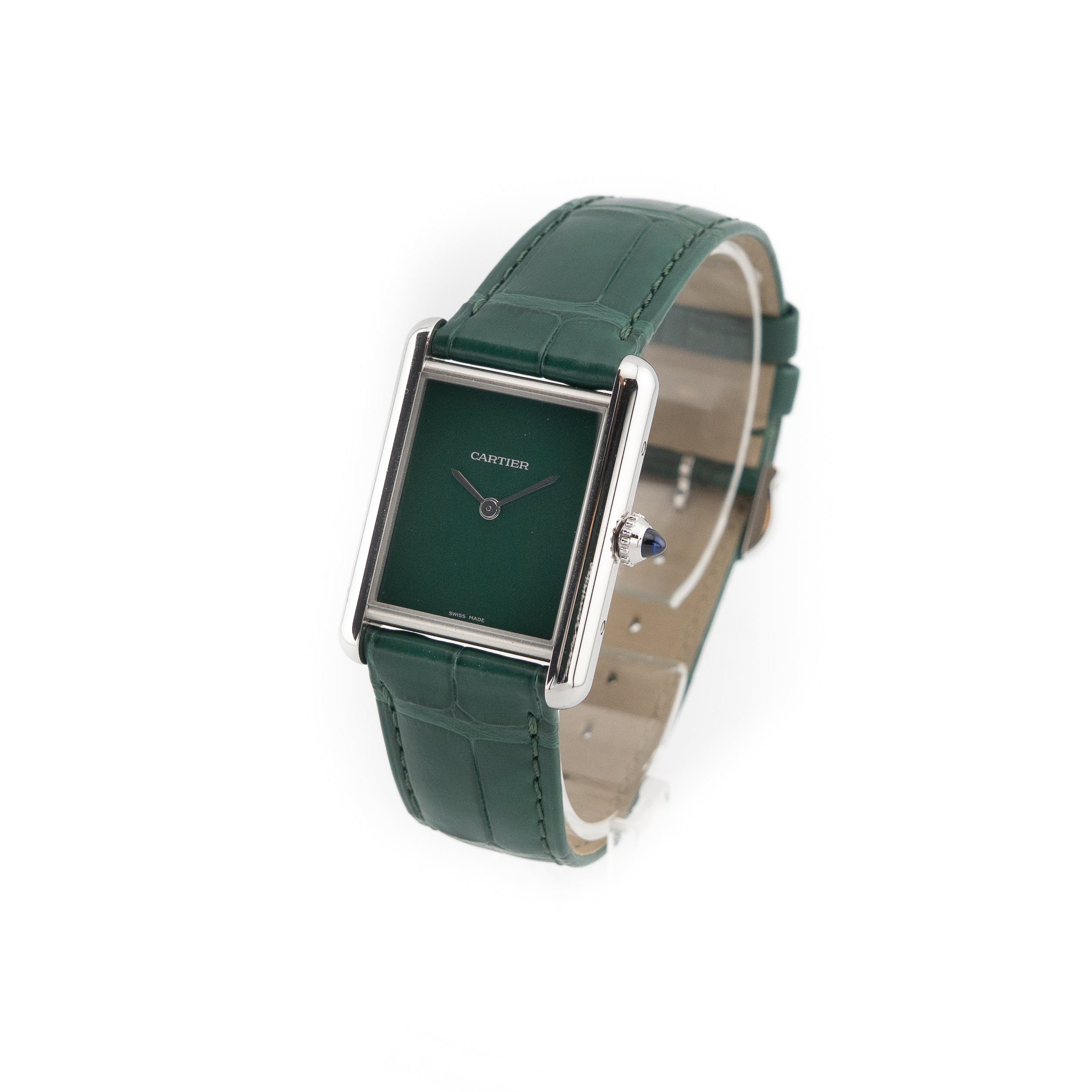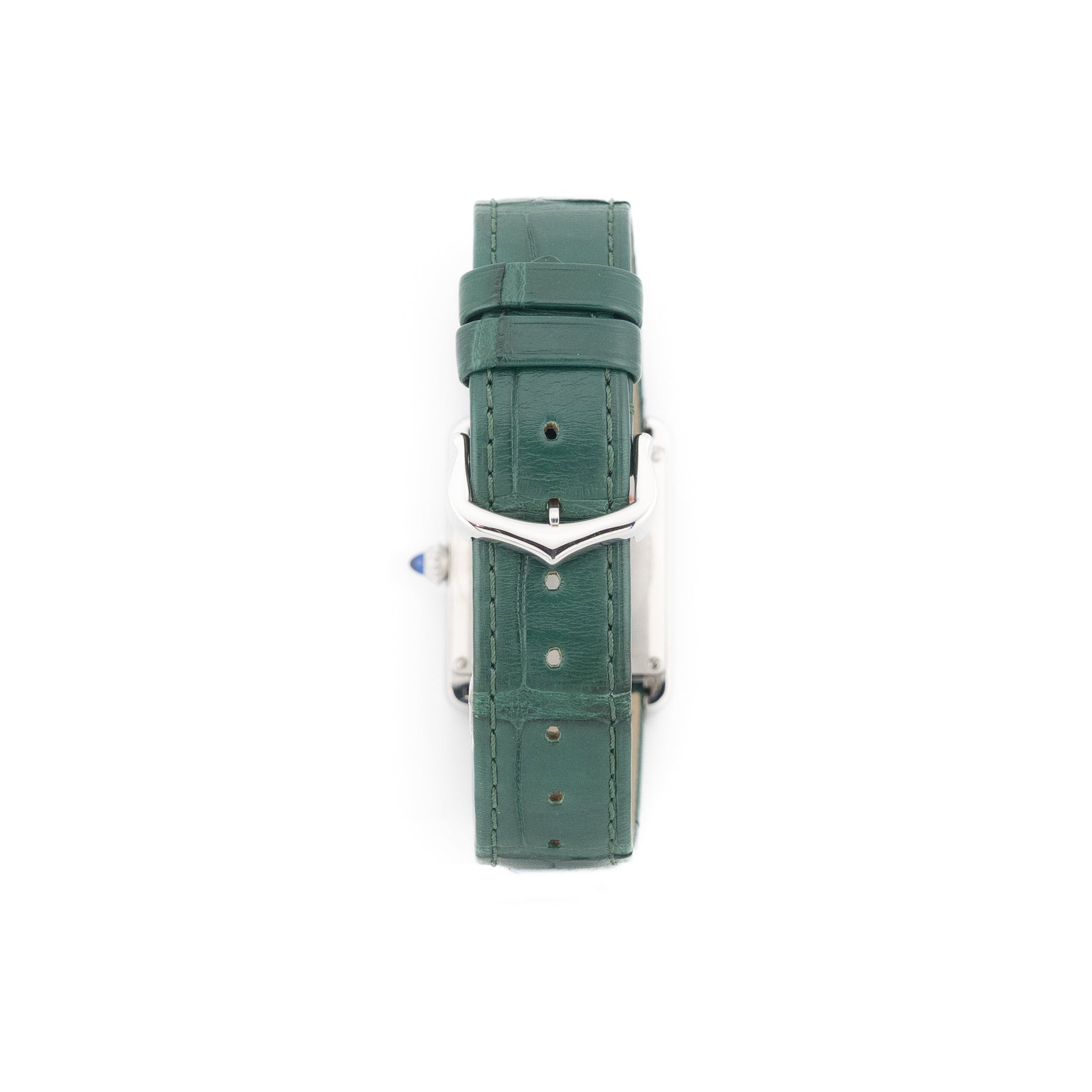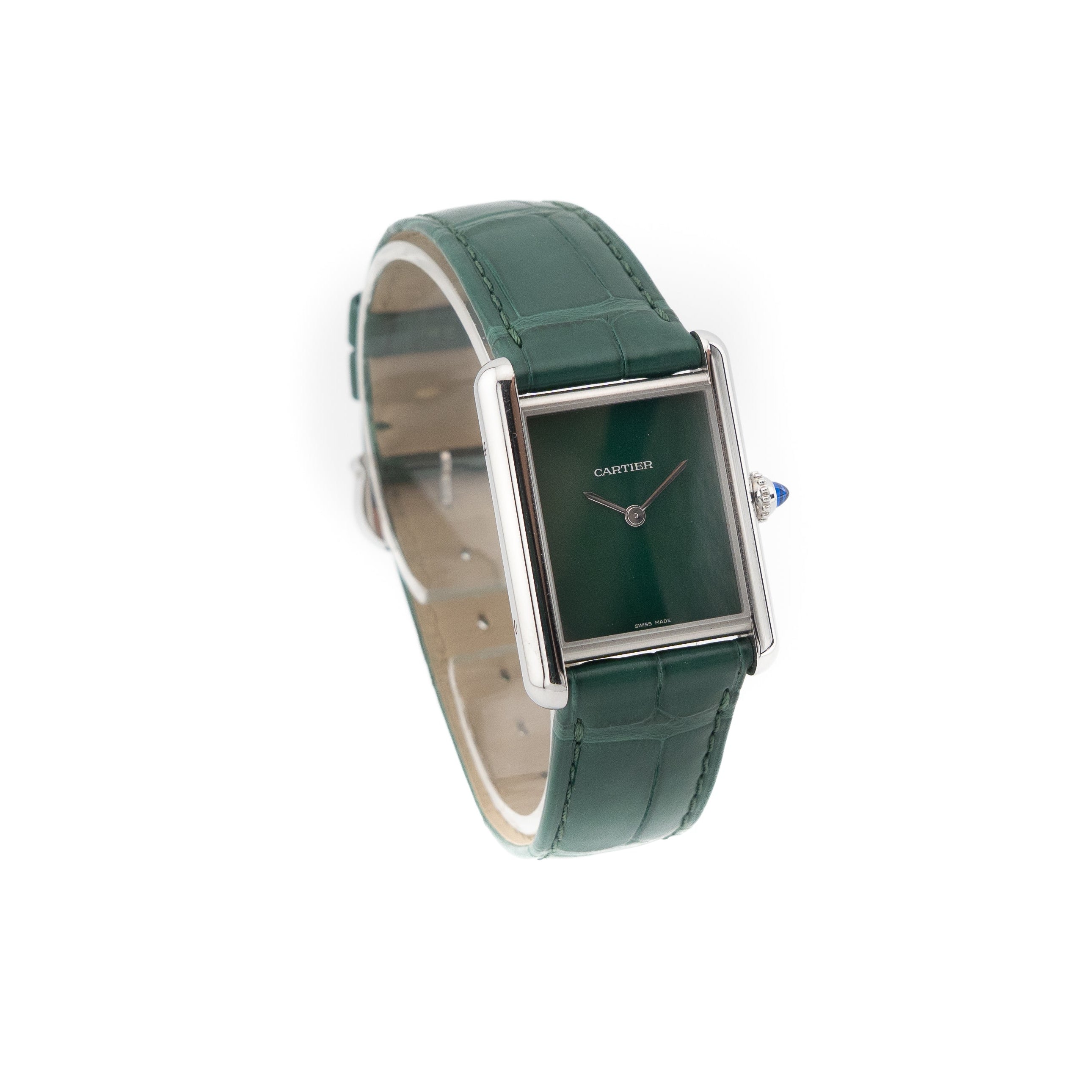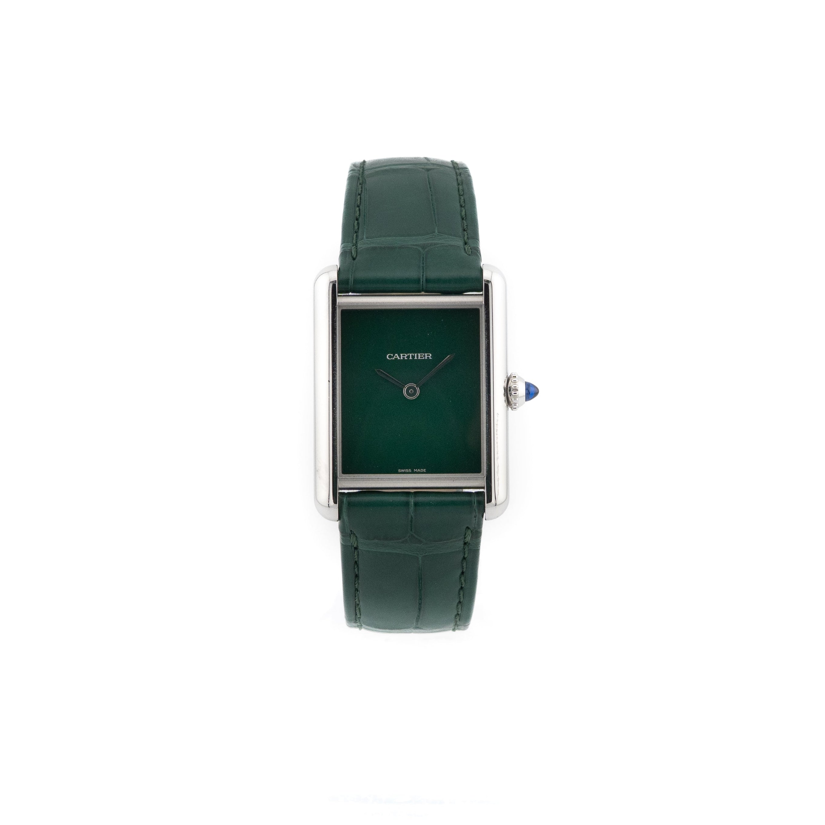 Tank Must watch, large model, quartz movement. Steel case, beaded crown set with a synthetic cabochon-shaped spinel, silvered dial, blued-steel sword-shaped hands, black grained calfskin strap, steel ardillon buckle. Case dimensions: 33.7 mm x 25.5 mm, thickness: 6.6 mm. Water-resistant to 3 bar (approx. 30 metres).