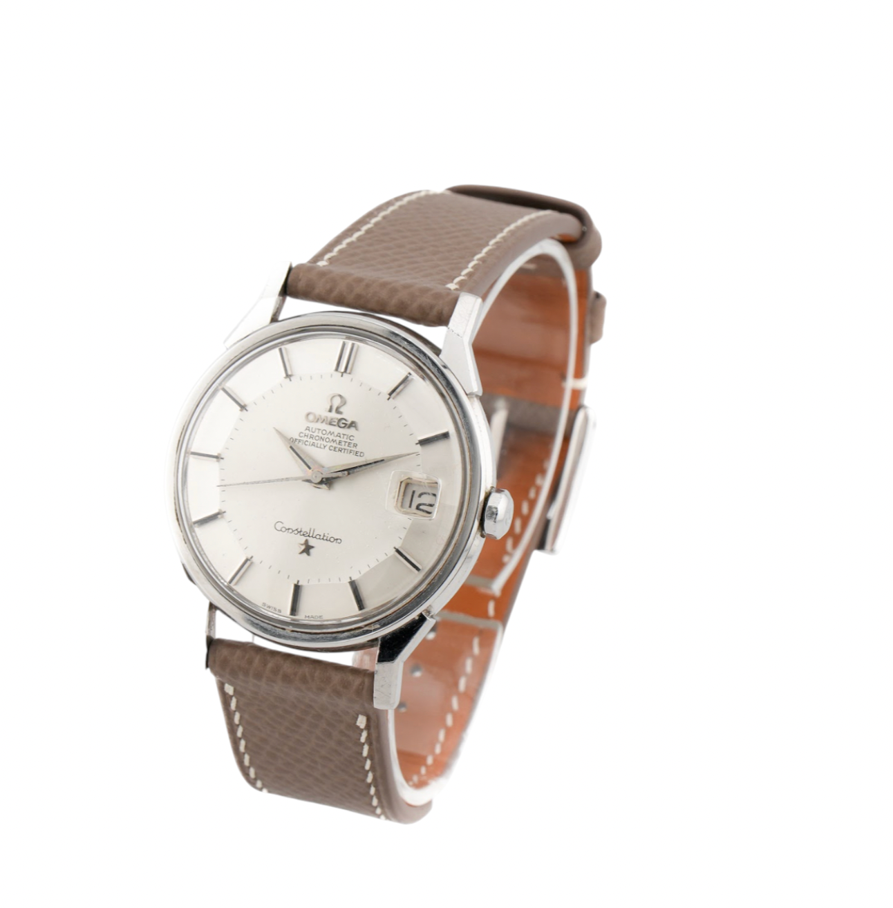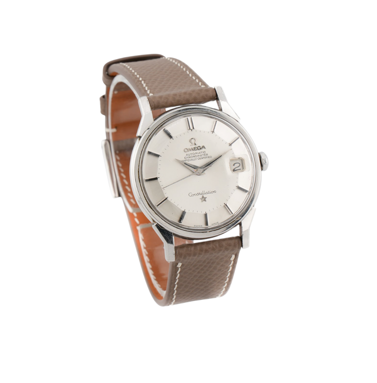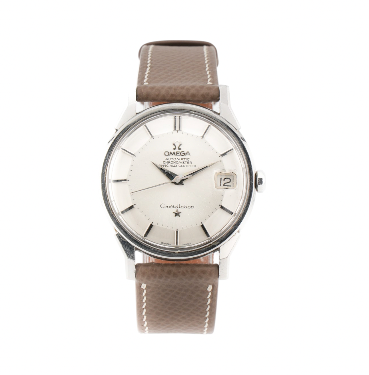 The Omega Constellation “Pie Pan” is a timeless vintage masterpiece that embodies the elegance and precision of mid-20th-century Swiss watchmaking. Introduced in the 1950s as part of Omega’s flagship chronometer line, the watch earned its nickname from the distinctive shape of its dial—flat in the center and gently sloping around the edges in twelve angled facets, resembling an inverted pie pan. This unique design creates depth and light play, giving the watch an instantly recognizable character. Housed in a 34mm case crafted from stainless steel, the Pie Pan features refined details such as sharp “dog-leg” lugs, dauphine hands, and applied hour markers.