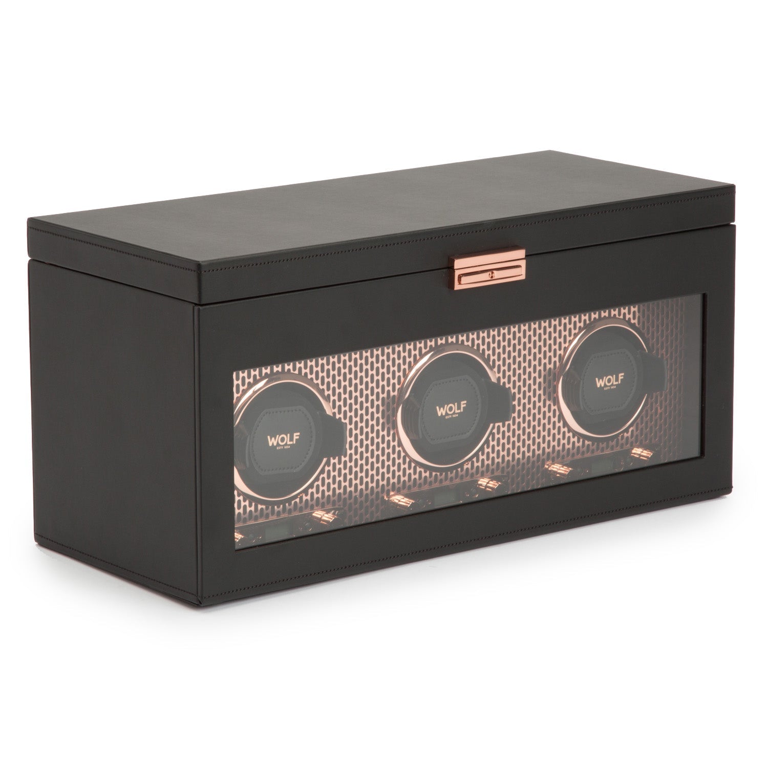 Copper plated laser cut perforated steel melded with clean, sleek lines. AXIS drives a modern, bold look for safekeeping your timepieces. Our patented technology of counting rotations of the axis of your watch guarantees precise turns per day. Bold luxury, faultless design, take AXIS for a spin. Features microsuede interior, locking glass cover, backlit LCD display, copper finished hardware, and 3 winding modules with storage.