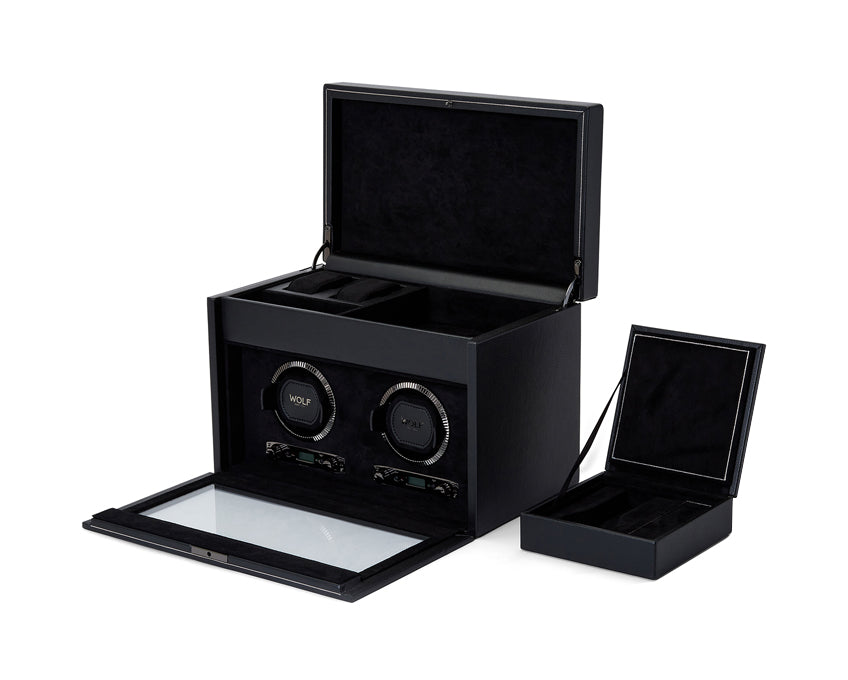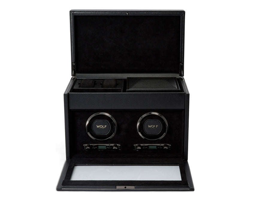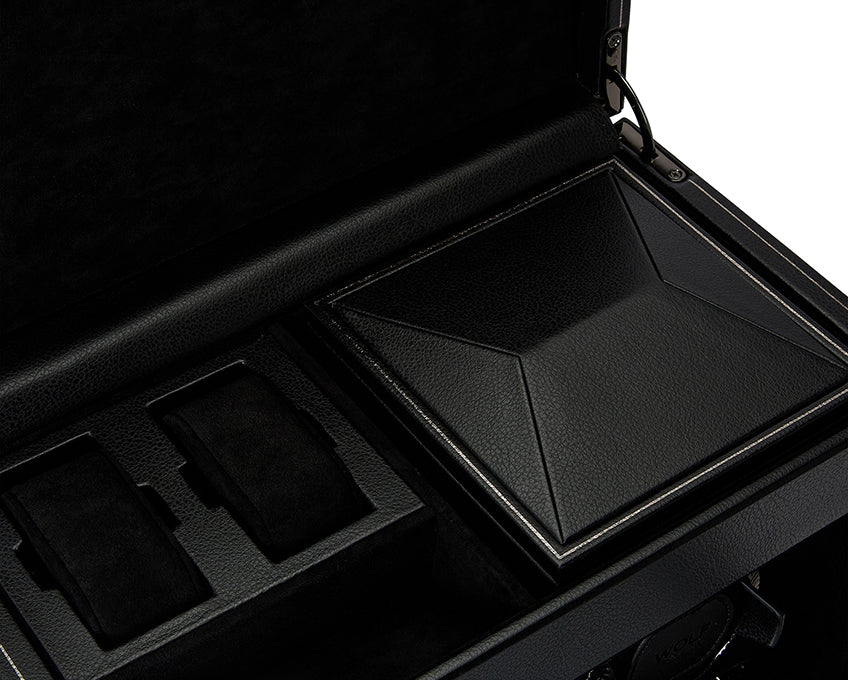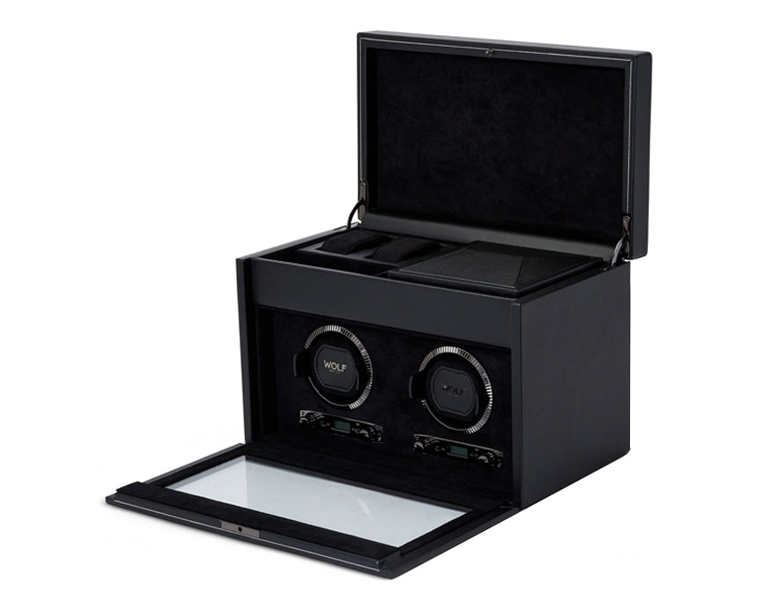 - Storage: 2 winding modules, 2pc watch storage with suspended cushions (cuff will accommodate up to 52mmcase) 1 open compartment, travel case (1pc watch storage, 1 lidded compartment)