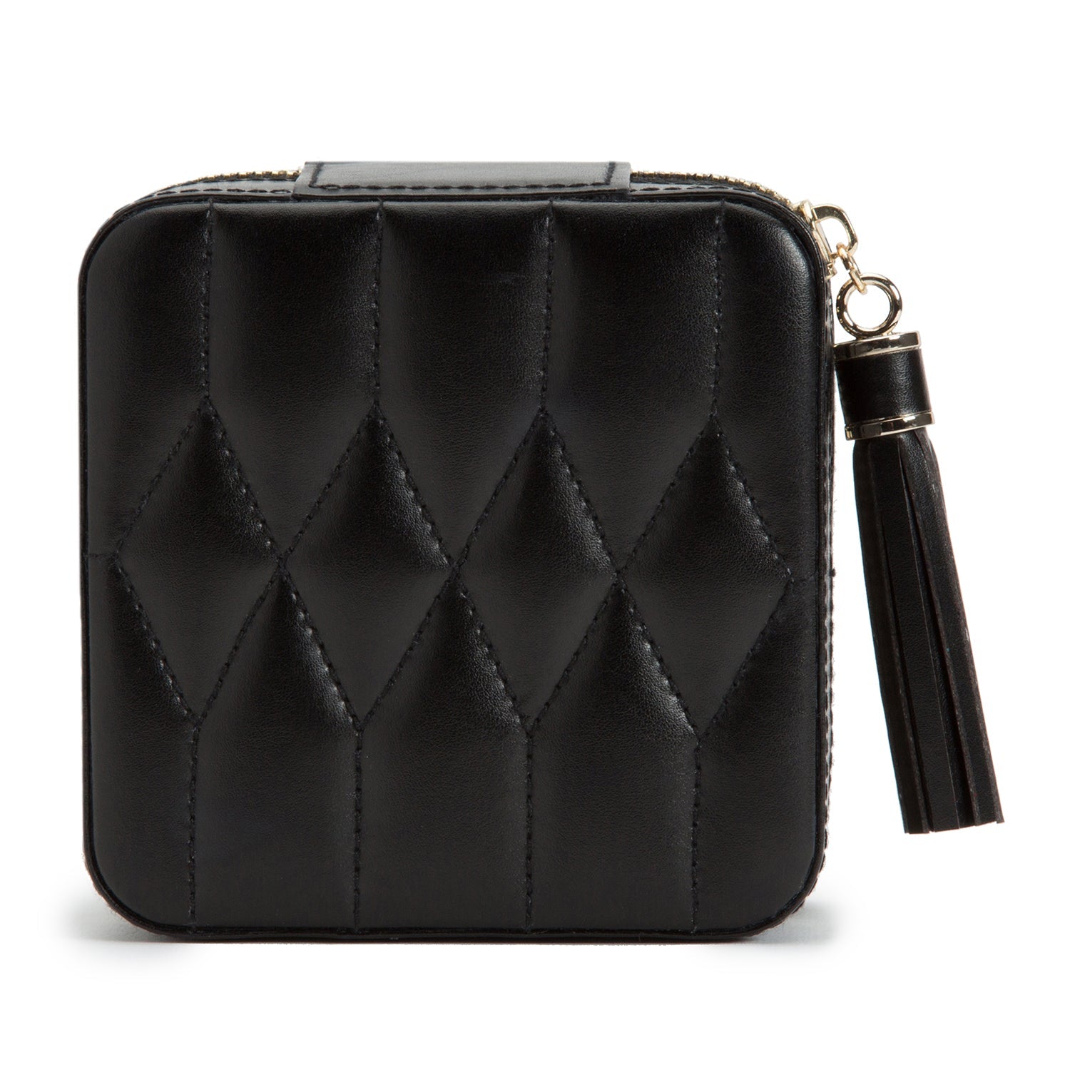 The embodiment of sophistication and style. Caroline, a timeless classic with elegant soft lines of the 50's, supple diamond quilted leather accented with gold hardware. This refined black zip travel case is the perfect home for your precious jewellery and heirlooms. Traveling with Caroline makes safekeeping your jewellery whilst on the go a snap.