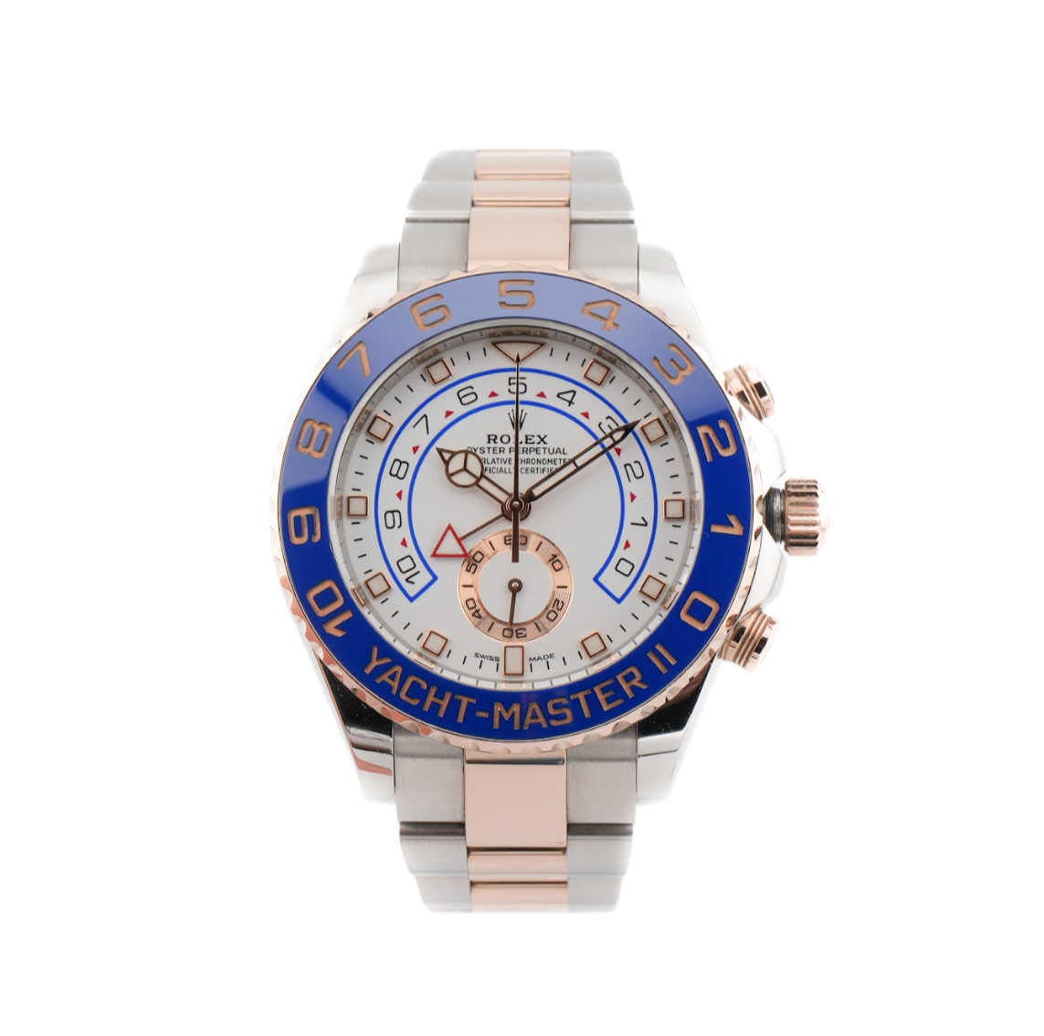 The Rolex Yacht-Master II reference 116681 is a striking blend of luxury and precision engineering, designed for professional sailors and maritime enthusiasts alike. Crafted from a combination of Oystersteel and 18ct Everose gold, this 44mm regatta chronograph stands out with its commanding presence and nautical elegance. At its heart lies the Rolex Calibre 4161 — a sophisticated self-winding movement with a programmable countdown timer and mechanical memory, a feature specifically engineered for yacht racing.