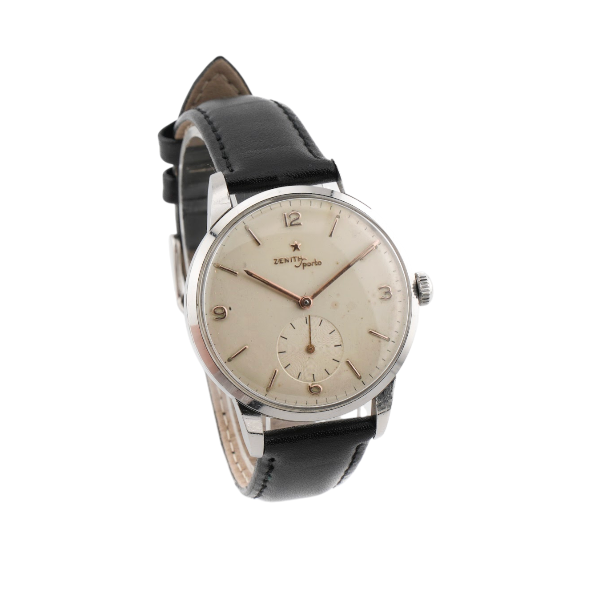 The Zenith Sporto exemplifies this legacy with its classic 37.5 mm steel case, warm beige dial with gentle patina, and reliable manual Calibre 40 movement — featuring a patented internal plexiglass element to protect the mechanism. Completed with a charming sub-seconds display, this vintage piece embodies understated elegance and timeless craftsmanship.